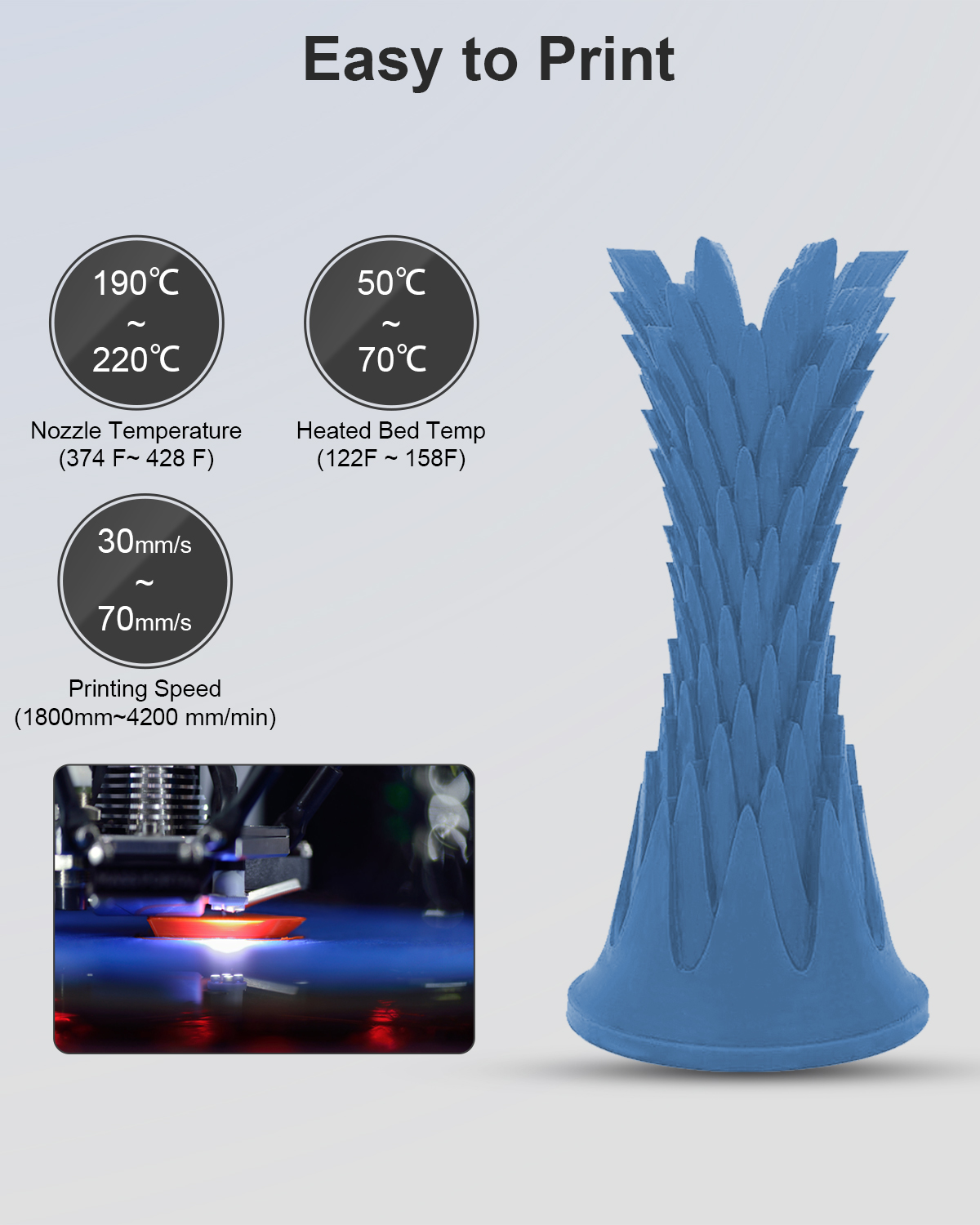 [Легко печатать]-Печатать так же легко, как и обычный PLA, получайте качественные отпечатки с четкими деталями. Рекомендуемая температура экструзии/сопла: 190C-220C (374 ℉ ~ 428 ℉), температура подогреваемой кровати: 50C-70C(122 ℉ ~ 158 ℉).