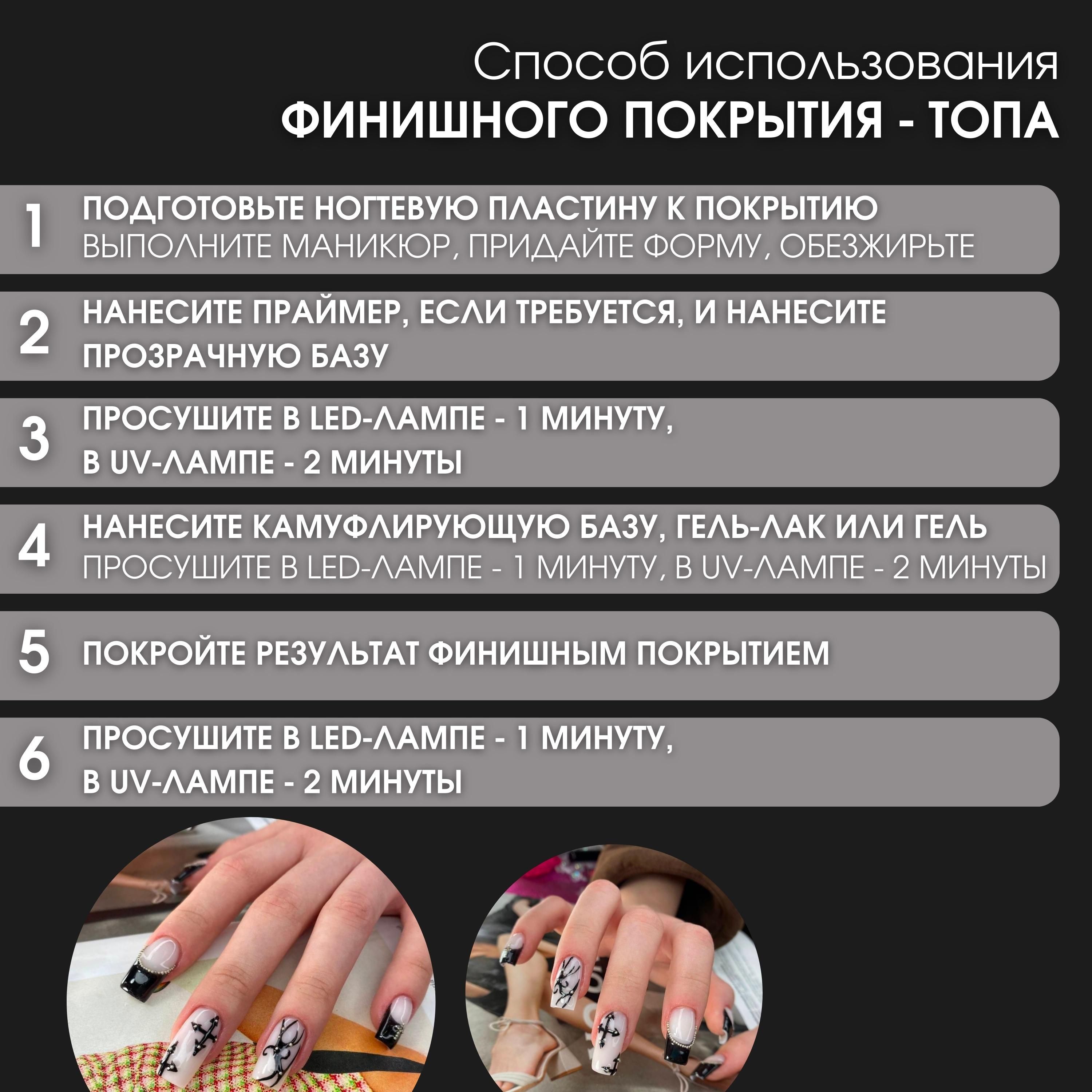 Применение топ-геля простое и быстрое. После нанесения желаемого цвета лака, нанесите один слой матового топ-геля на каждый ноготь и подержите ногти в ультрафиолетовой лампе. Полученный результат превзойдет все ваши ожидания.