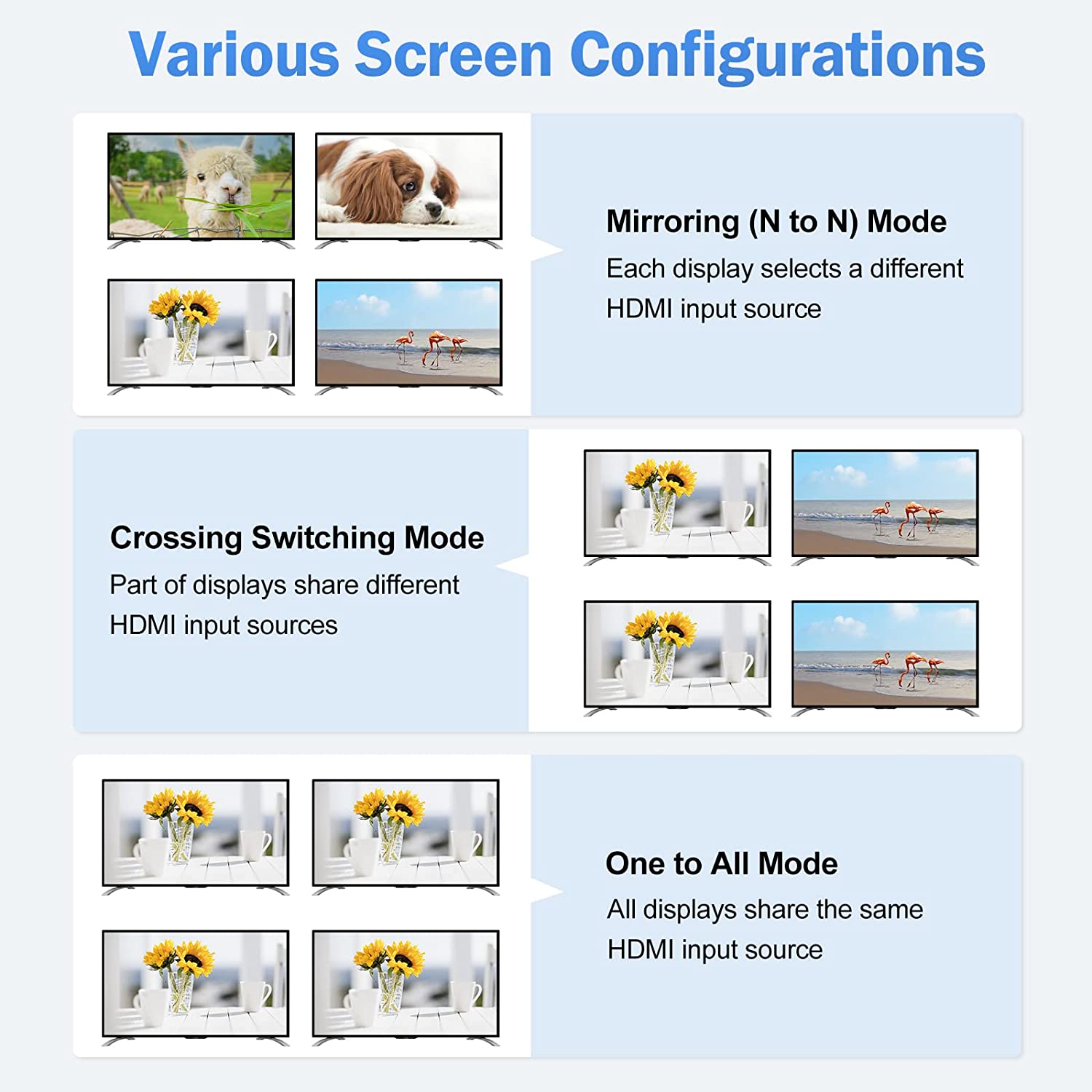 1. This 4X4 HDMI matrix can switch between 4 input source devices and distribute the signals to 4 displays (4 displays can display the same picture or display different pictures).
