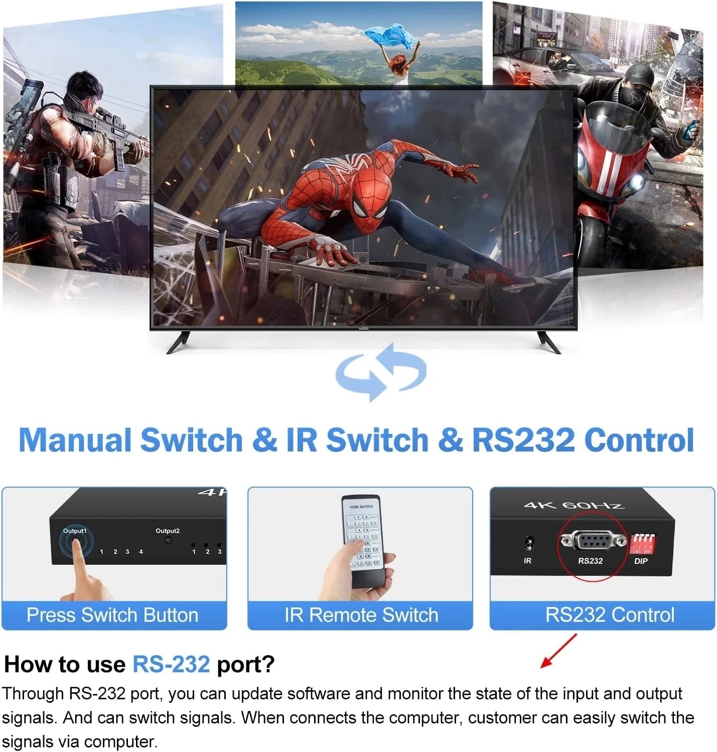 3. Control the matrix switcher through RS232 or IR remote control to meet your different usage scenarios.