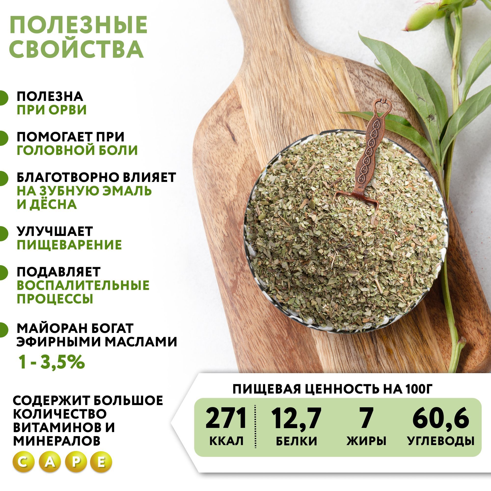 Описание: Майоран – растение с уютным ароматомМир пряностей и приправ невероятно богат. Слава о чудодейственном майоране распространялась ещё со времён Древнего Египта. Майоран имеет тёплый душистый аромат, чем-то отдалённо напоминающий терпкость шалфея.Текстовое описание изображенияМайоран: применениеНежный вкус и пряный аромат майорана ценят и применяют в различных кухнях мира. Майоран добавляют в овощные блюда, к листовым салатам, овощам, в блюда из злаков и бобовых, в овощные бульоны и маринады, в салатные заправки и соусы, несладкую выпечку, в сдобу, в согревающие и освежающие напитки. Приправу используют для ароматизации растительных масел.Текст при отключенной в браузере загрузке изображенийМайоран: полезные свойстваОгромное количество целебных свойств майорана объясняется составом этого растения, в который входит: