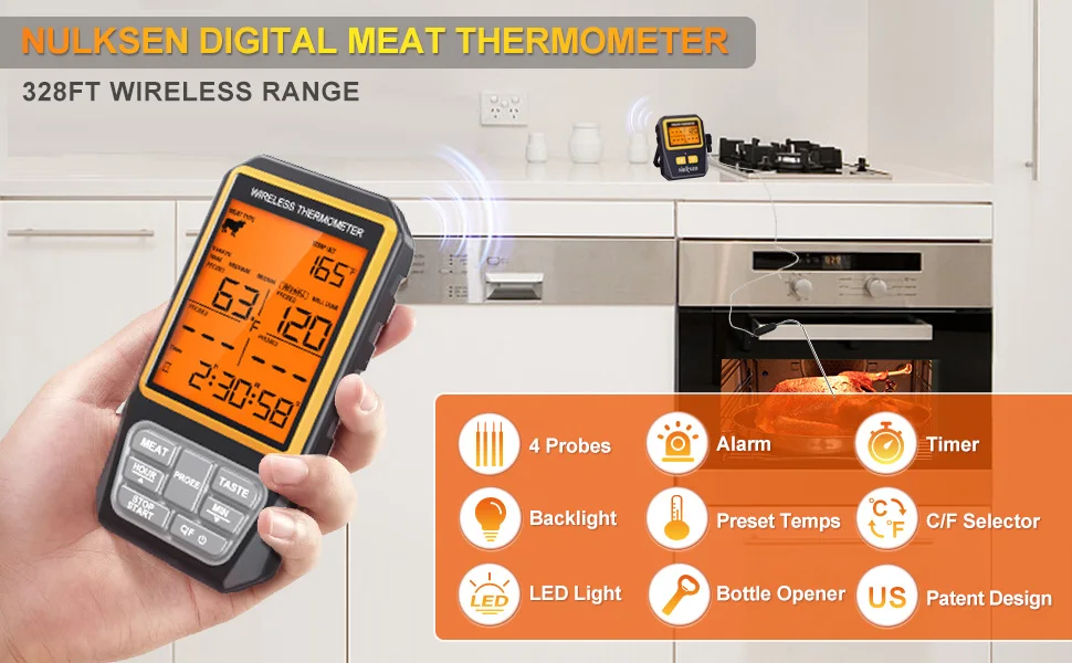 С термометром Nulksen для гриля вам не нужно беспокоиться и догадываться, достигло ли мясо идеальной готовности. Просто читая температуру с большого экрана дисплея, вы можете стать профессионалом и лучше подготовиться к вечеринке с барбекю. Этот беспроводной термометр подходит не только для приготовления мяса, но и для широкого спектра определения температуры всех видов приборов.