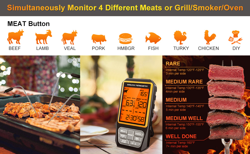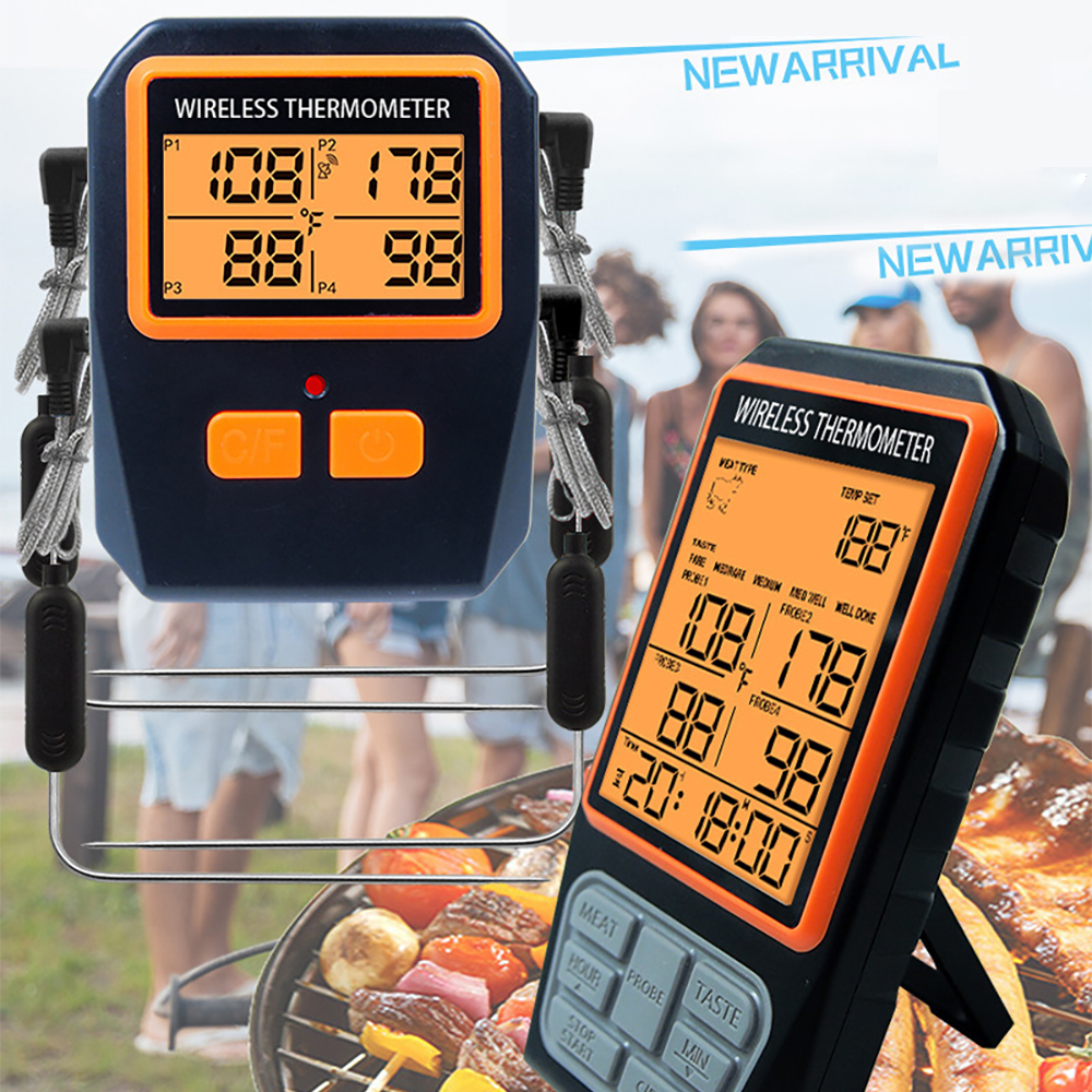 MeatChamp 4 датчика, ЖК-дисплей с подсветкой, беспроводной диапазон 100 м, Цифровой Кухонный Термометр для приготовления пищи, барбекю, духовки, мяса с сигналом