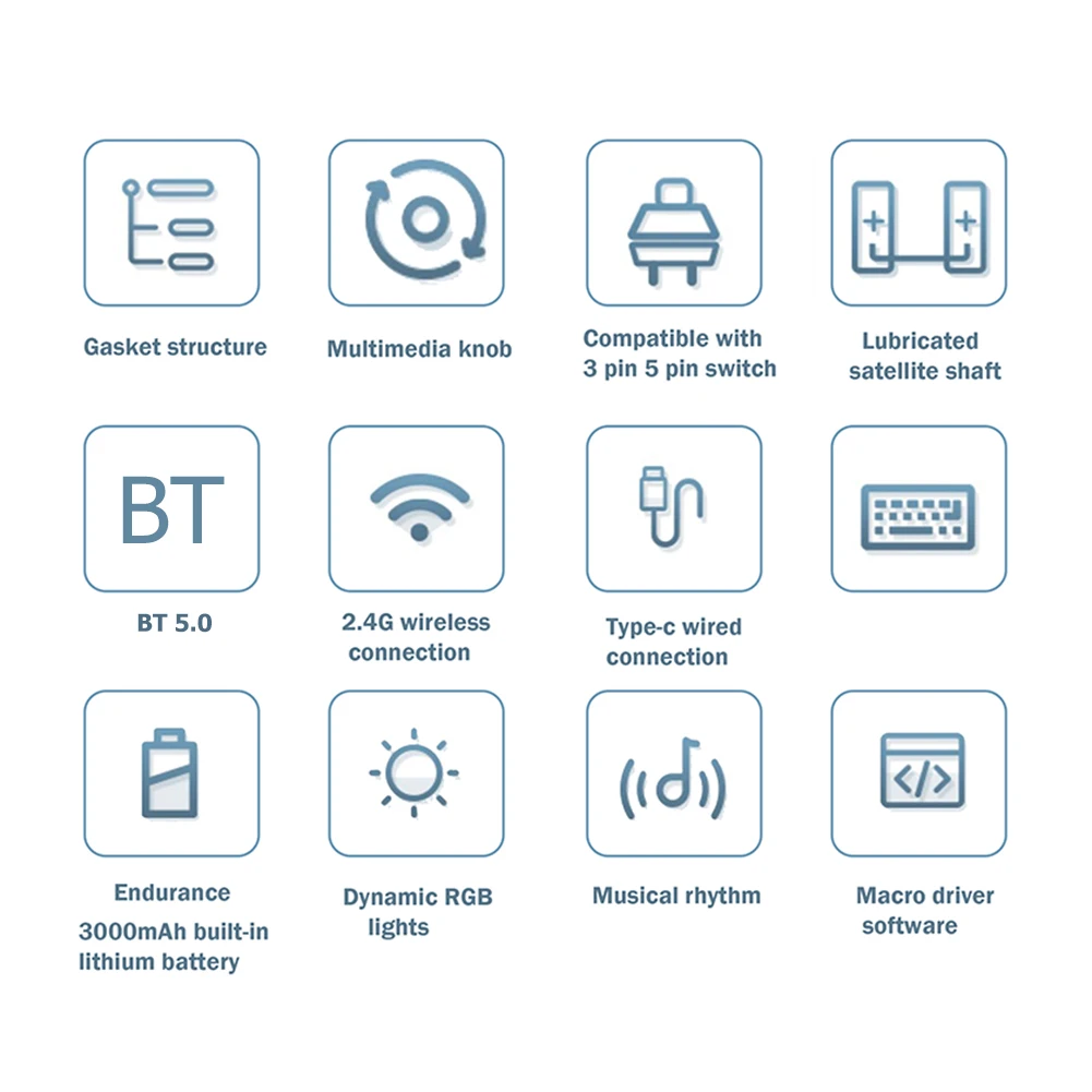 1. 3 режима:GM068-стандартная 67 клавиш, 3 режима игровой подсветки RGB-клавиатуры в механическом проводном переключателе + Bluetooth-совместимый + 2,4G. Он поддерживает онлайн-обновление прошивки через USB, комбинацию клавиш FN для переключения аппаратных функций, NKRO, настройку нескольких режимов подсветки, а также экранирование и разработку оконных функциональных клавиш.