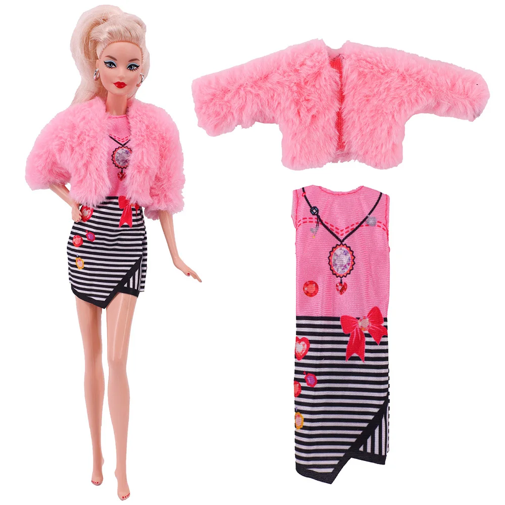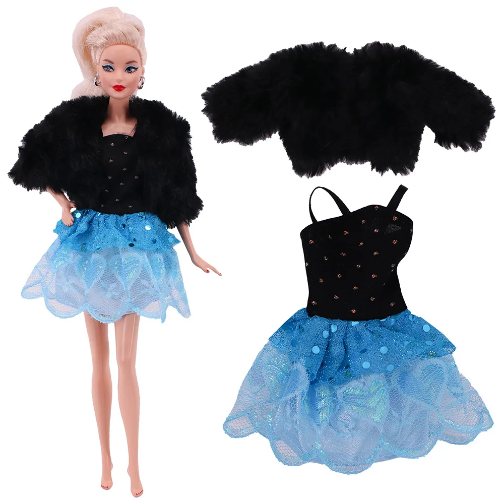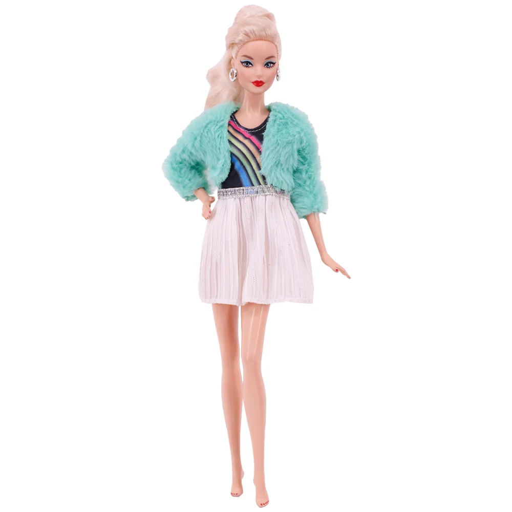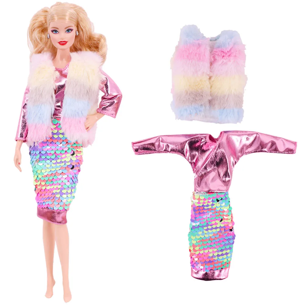 Меховое пальто + юбка, сексуальная одежда для Барби, плюшевый жилет, блестящая юбка с запахом, Одежда для куклы, наряд, платье, модное пальто, аксессуары для кукол, подарки