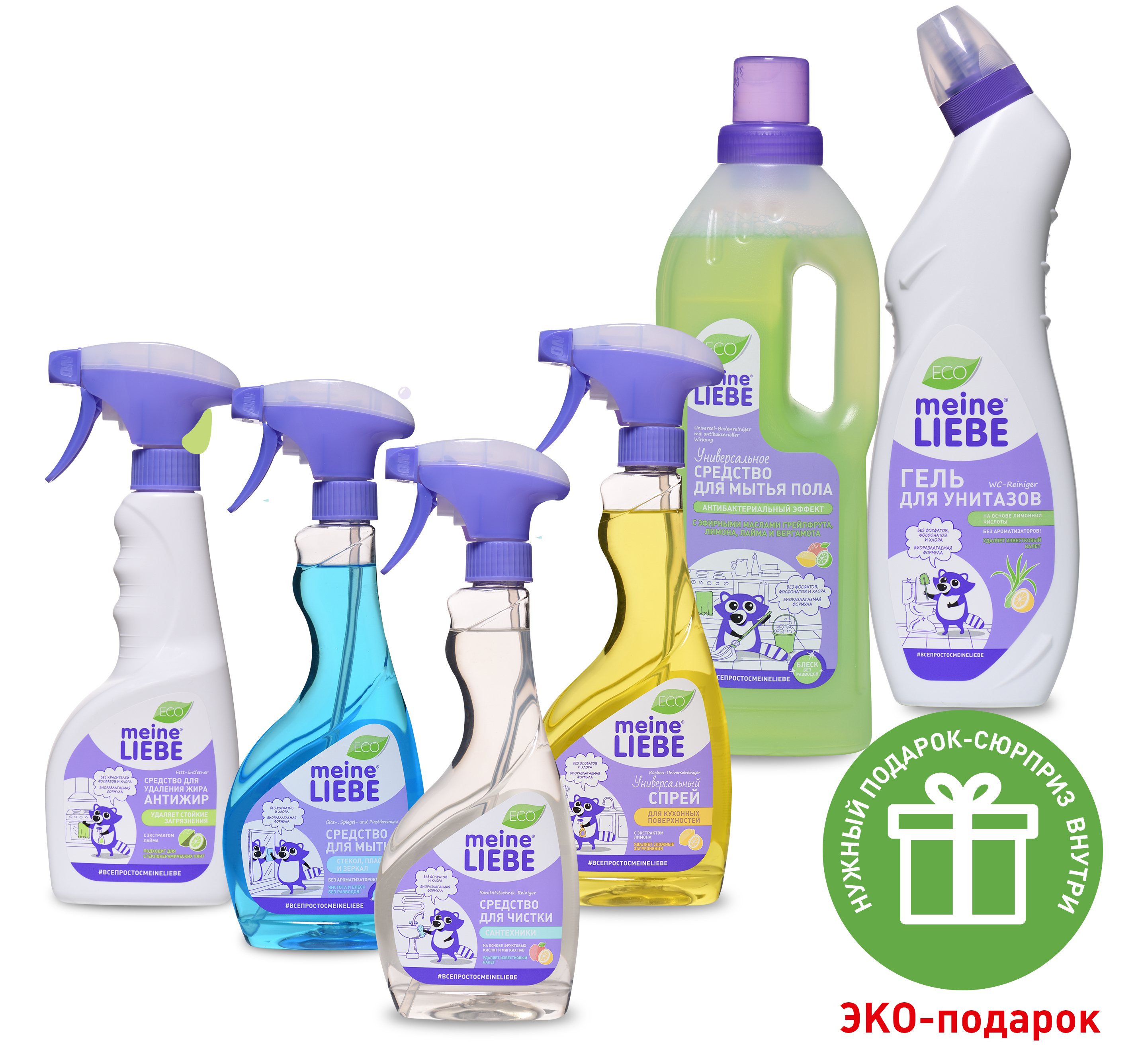 1. Эко-средство для стекол и зеркал с антистатическим эффектом 500мл 2. Чистящее эко-средство для сантехники на основе фруктовых кислот 500мл 3. Чистящее средство для удаления стойких загрязнений АНТИЖИР 500 мл 4. Чистящий ЭКО-спрей для кухни с экстрактом лимона 500мл 5. Антибактериальный ЭКО-гель для мытья пола с эфирными маслами грейпфрута, бергамота 750 мл 6. Чистящий ЭКО-Гель для унитазов на основе лимонной кислоты 750мл+Подарок: MEINE LIEBE Кислородный Карандаш-пятновыводитель для детского белья ЭКО, без хлора, фосфатов или MEINE LIEBE Универсальное моющее средство с дезинфицирующим эффектом