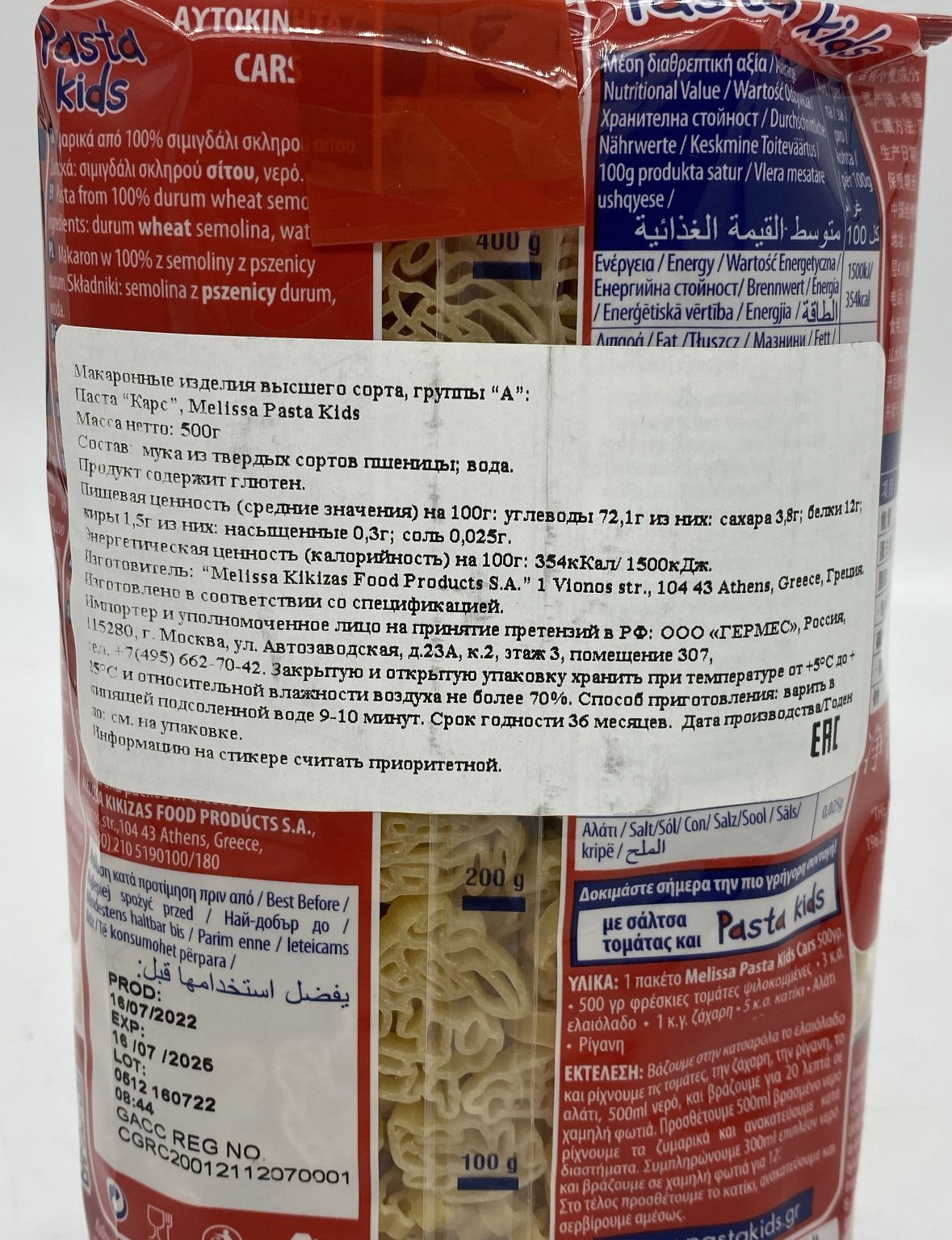 Melissa/ Макароны детские Pasta Kids "Карс", Cars, Греция, 2шт х 500г.
