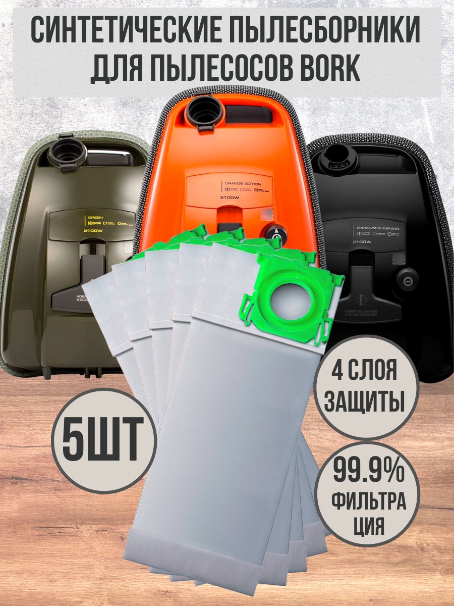 Описание: Набор пылесборников для пылесоса Bork в количестве 5шт. Многослойные мешки задерживают до 99,9% бытовой пыли и мельчайших частиц, благодаря особому нетканому материалу повышенной плотности: мелтблаун. В отличие от бумажных мешков для сбора пыли, синтетические не порвутся от влаги, более того, задержат ее внутри и предотвратят попадание в моторный отсек пылесоса. Также из-за отсутствия бумаги в составе, достигнута высокая прочность, что делает аксессуар устойчивым к острым предметам и высокой мощности всасывания пылесоса, когда нередки случаи разрыва бумажного мешка. Немаловажно использовать одноразовые сменные расходники, так как они значительно лучше берегут пылесос от попадания пыли в моторный отсек и преждевременного загрязнения Hepa фильтра. Также нет необходимости трусить тканевый мешок и дышать пылью, ведь легче заменить пакет на новый без контакта с мусором, что более гигиенично и особенно важно для аллергиков. Наши мешки не являются универсальными, они подходят на пылесосы Bork серий V700, V701, V702, V703, V705, V7010, V7011, V7012, V7013, VC9721, VC9821, VC9921, а цифры вида 1600W, 1800W, 2000W, 2200W означают его мощность потребления электроэнергии. Если вы сомневаетесь, подойдут ли наши мешки к вашему пылесосу, напишите его модель в разделе «Вопросы», мы обязательно ответим