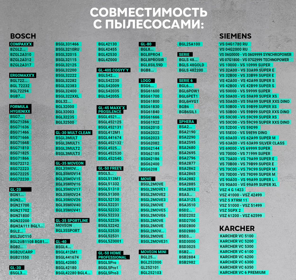Полный список совместимых моделей пылесосов BOSCH: Activa..., Activa Magic…, Alpha..., Alpha/Silence..., Aquarea..., BBS 3112, BBS 3114, BSA 000 KA...999 KA, BSB 2080, BSD 3083, BGB 2…, BGB 45…, BSG, BSGL…, Casa..., Compacta..., Formula & Hygienixx..., Free'e ProSilence..., Free'e BSGL..., GL30 BGSL..., GL40 BGSL..., GL50 BGSL..., Junior C 600, Logo BSA..., Logo BSG..., Maximo..., Maxx'x..., Move..., MoveOn..., Natura..., Optima..., Perfecta..., Pro Silence BSG 71866AU, Silence/Solida..., Sphera..., Terrossa..., Ultra BSF... .             Полный список совместимых моделей пылесосов SIEMENS: BS 55, Edition 150, Green Energy, Hygienic Power..., Junior 600, M 5.0 VS M5..., VS 320...339, VS 420...499, VS 90 A..., VSQ4G2130, Power Edit. Evolution…, Rapid VS 04 G..., Q 4.0 Silence Power..., Super..., Super 10/100 VS..., Super VS..., Super C..., Super E..., Super M..., Super S..., Super XS..., Synchropower, Technopower, Z 3.0..., Z 4.0..., Z 5.0..., Z 6.0..., VSZ 7... .          Также подходит к пылесосам Karcher: VC 5200, VC 5300, VC 6000...6999