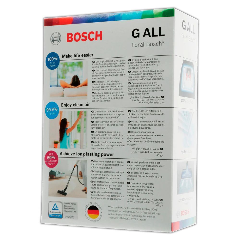 - Мешки для пылесоса подходят для всех моделей современных пылесосов Bosch: BSGL5.. (GL-50 Free'e), BGL45.., BGL8.. (In'genius ProSilence и Home Professional), BGB45.. (Maxx'x), BGL4.. (GL-40), BGL35.. (MoveOn), BGL3.., BSGL3.. (GL-30), BGL2.. (GL-20), BSG6.. (Logo), BSG4.., BSG7.., BSGL2.., BSA.., BSD.., BSF.., BBS.., BSC..; за исключением серий BSG8.., BSN.., BSG1..