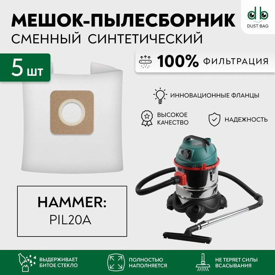 Описание: Мешки для пылесоса синтетические сменные европейского качества бренда DUST BAG разработаны для пылесоса Hammer PIL20A, 20 л.