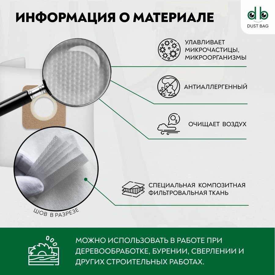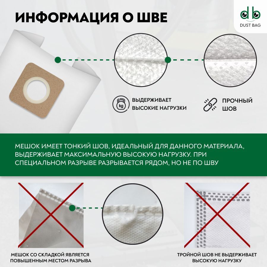3 плотных слоя нетканного микроволокна обеспечивают высокий уровень фильтрации. Мешки для пылесоса выдерживают все виды мусора, в том числе острые предметы, осколки стелок, строительный мусор, бытовую пыль и прочие загрязнения.