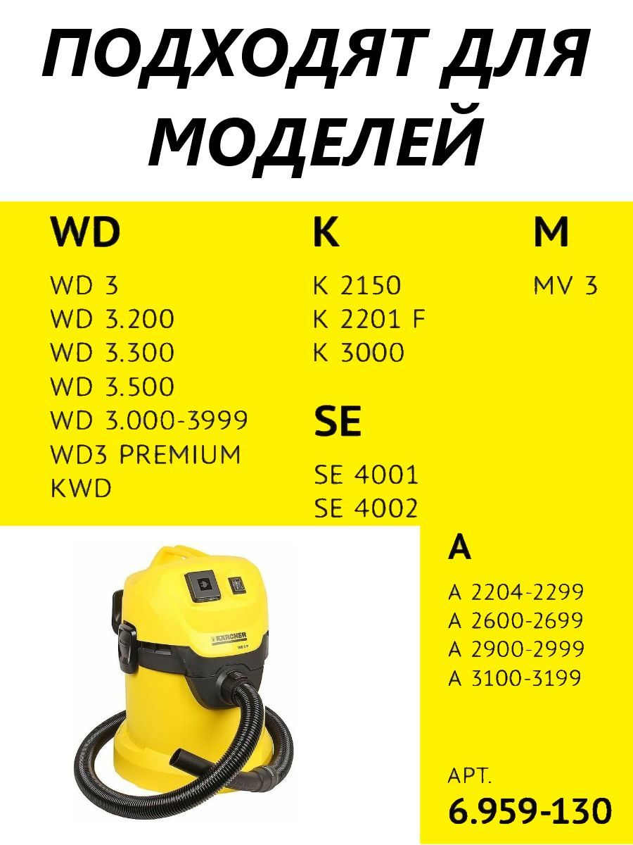 Комплект содержит 5 мешков и подходит для пылесосов Karcher: KARCHER WD3, MV3, WD3000-WD 3.9999, SE 4001, SE 4002, 6.959-130.0