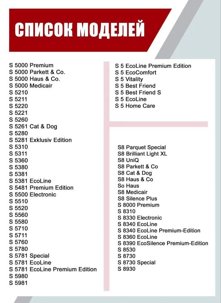 • Complete С3, Complete C2, Classic C1,• S8 S8000 - S8999,• S5 S5000 - S5999,• S2 S 2000 - S2999,• S800 - S858,• S600 - S658,• S 4000, S 4000 EcoLine, S 4210, S 4211, S 4212, S 4260, S 4262 Cat & Dog, S 4280, S 4512, S 4560, S 4562, S 4580, S 4780, S 4781, S 4782, S4 EcoLine, S4 EcoLine Premium Edition.• Complete C3 (S8), SGFAO, SGFA3, SGJAO, SGDAO, SGDA3, SGPAO, SGEAO, SCMAS, SGSA1, SGSA3, SGSE1, SGSC1.• Classic C1, SBADO, SBAD3, SBCD3.• Compact C2 (S6), SDBBO, SDMBO, SDABO, SDCBO.• Compact C1, SBADO.• Hybrid, S 242-S 262i, S 290-S 381, Tango Plus, Electronic 3800, S 400-S 458, S 500-S 578, S 600-S 658, S 700-S 762, S 800-S 826.• S 2110, S 2131, S 2111, S 2131 EcoLine, S 2120, S 2180, S 2121, S 2210 Electronic, S 2130.• S 6000, S 6000 Silent&Compact, S 6000 Parkett&Co, S 6000 Cat&Dog, S 6210, S 6220 Cat&Dog, S 6230, S 6240 EcoLine, S 6260, S 6260 Premium Edition, S 6300 Electronic, S 6350 Compact, S 6360 Exklusiv Edition, S 6730, S 6760.• 5000 Premium, S 5000 Parkett & Co., S 5000 Haus & Co., S 5000 Medicair, S 5210, S 5211, S 5220, S 5221, S 5260, S 5261 Cat & Dog, S 5280, S 5281 Exklusiv Edition, S 5310, S 5311, S 5360, S 5380, S 5381, S 5381 EcoLine, S 5481 Premium Edition, S 5500 Electronic, S 5510, S 5520, S 5560, S 5580, S 5710, S 5711, S 5760, S 5780, S 5781 Special, S 5781 EcoLine, S 5781 EcoLine Premium Edition, S 5980, S 5981, S 5 EcoLine Premium Edition, S 5 EcoComfort, S 5 Vitality, S 5 Best Friend, S 5 Best Friend S, S5 EcoLine, S 5 Home Care.• S8 Parquet Special, S8 Brilliant Light XL, S8 UniQ, S8 Parkett & Co, S8 Cat & Dog, S8 Haus & Co, So Haus, S8 Medicair, S8 Silence Plus, S 8000 Premium, S 8310, S 8330 Electronic, S 8340 EcoLine, S 8340 EcoLine Premium-Edition, S 8360 EcoLine, S 8390 EcoSilence Premium-Edition, S 8530, S 8730, S 8730 Special, S 8930.