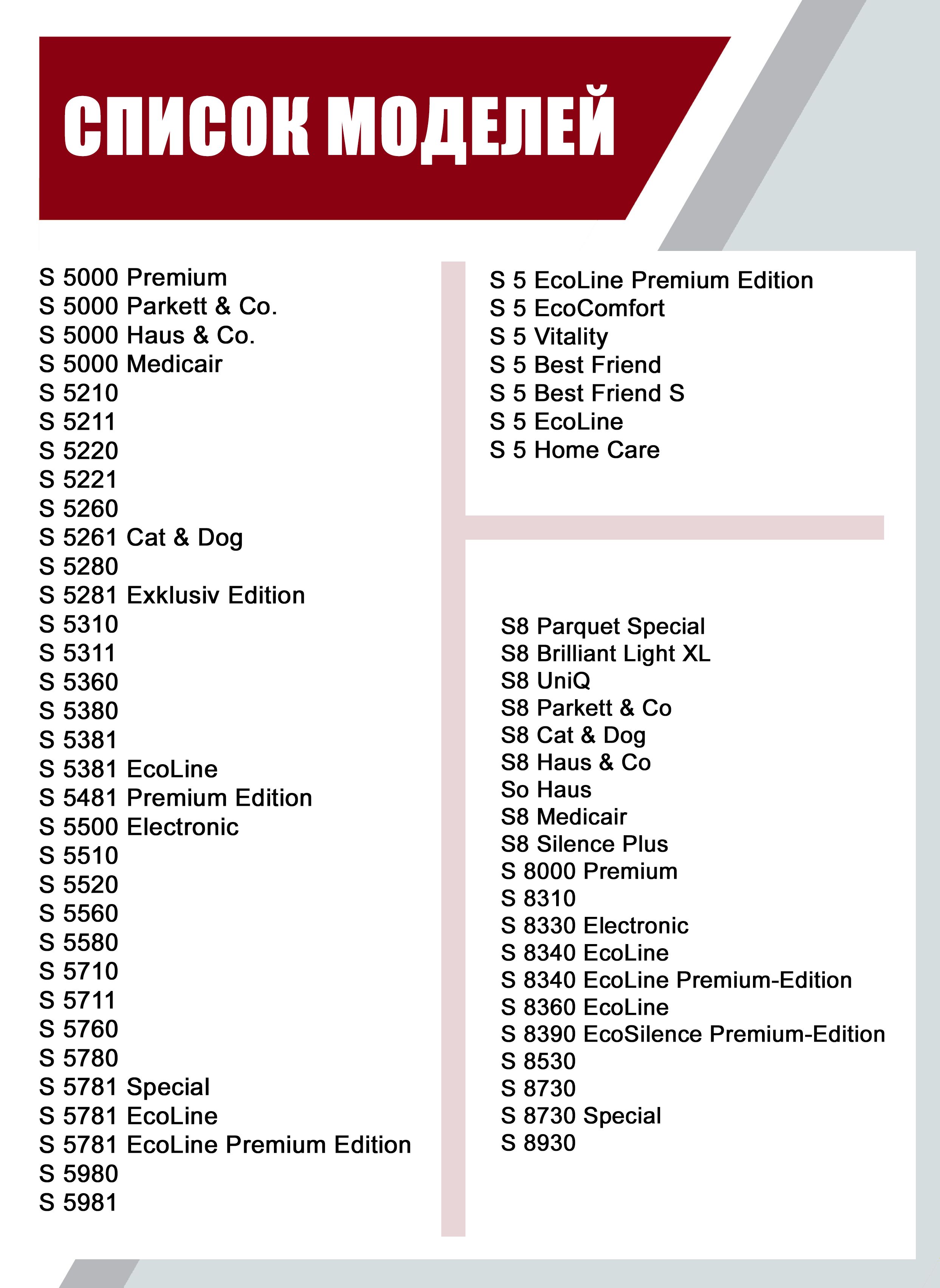 • 5000 Premium, S 5000 Parkett & Co., S 5000 Haus & Co., S 5000 Medicair, S 5210, S 5211, S 5220, S 5221, S 5260, S 5261 Cat & Dog, S 5280, S 5281 Exklusiv Edition, S 5310, S 5311, S 5360, S 5380, S 5381, S 5381 EcoLine, S 5481 Premium Edition, S 5500 Electronic, S 5510, S 5520, S 5560, S 5580, S 5710, S 5711, S 5760, S 5780, S 5781 Special, S 5781 EcoLine, S 5781 EcoLine Premium Edition, S 5980, S 5981, S 5 EcoLine Premium Edition, S 5 EcoComfort, S 5 Vitality, S 5 Best Friend, S 5 Best Friend S, S5 EcoLine, S 5 Home Care.