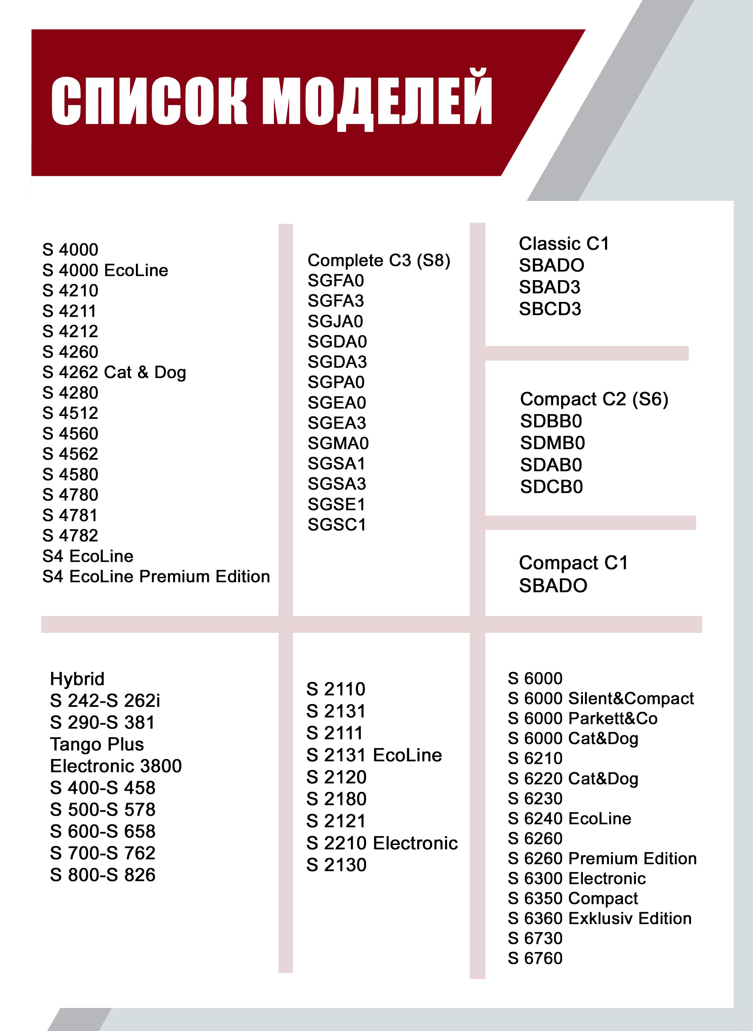 • S 6000, S 6000 Silent&Compact, S 6000 Parkett&Co, S 6000 Cat&Dog, S 6210, S 6220 Cat&Dog, S 6230, S 6240 EcoLine, S 6260, S 6260 Premium Edition, S 6300 Electronic, S 6350 Compact, S 6360 Exklusiv Edition, S 6730, S 6760.