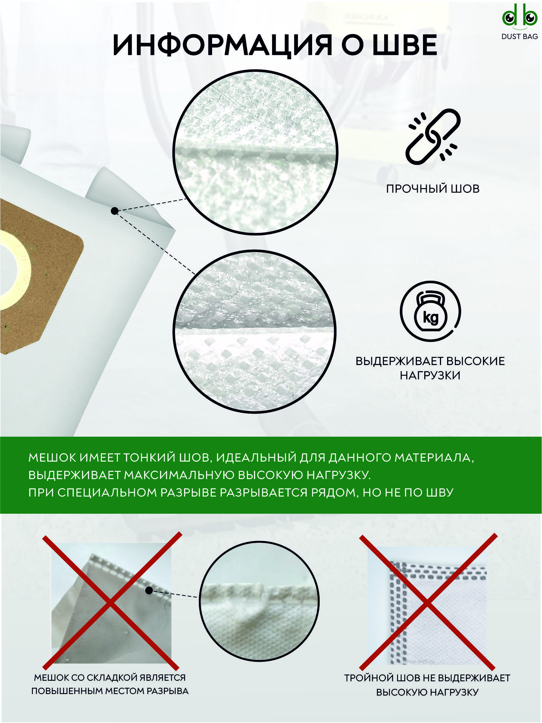 3 плотных слоя нетканного микроволокна обеспечивают высокий уровень фильтрации. Мешки для пылесоса выдерживают все виды мусора, в том числе острые предметы, осколки стелок, строительный мусор, бытовую пыль и прочие загрязнения.
