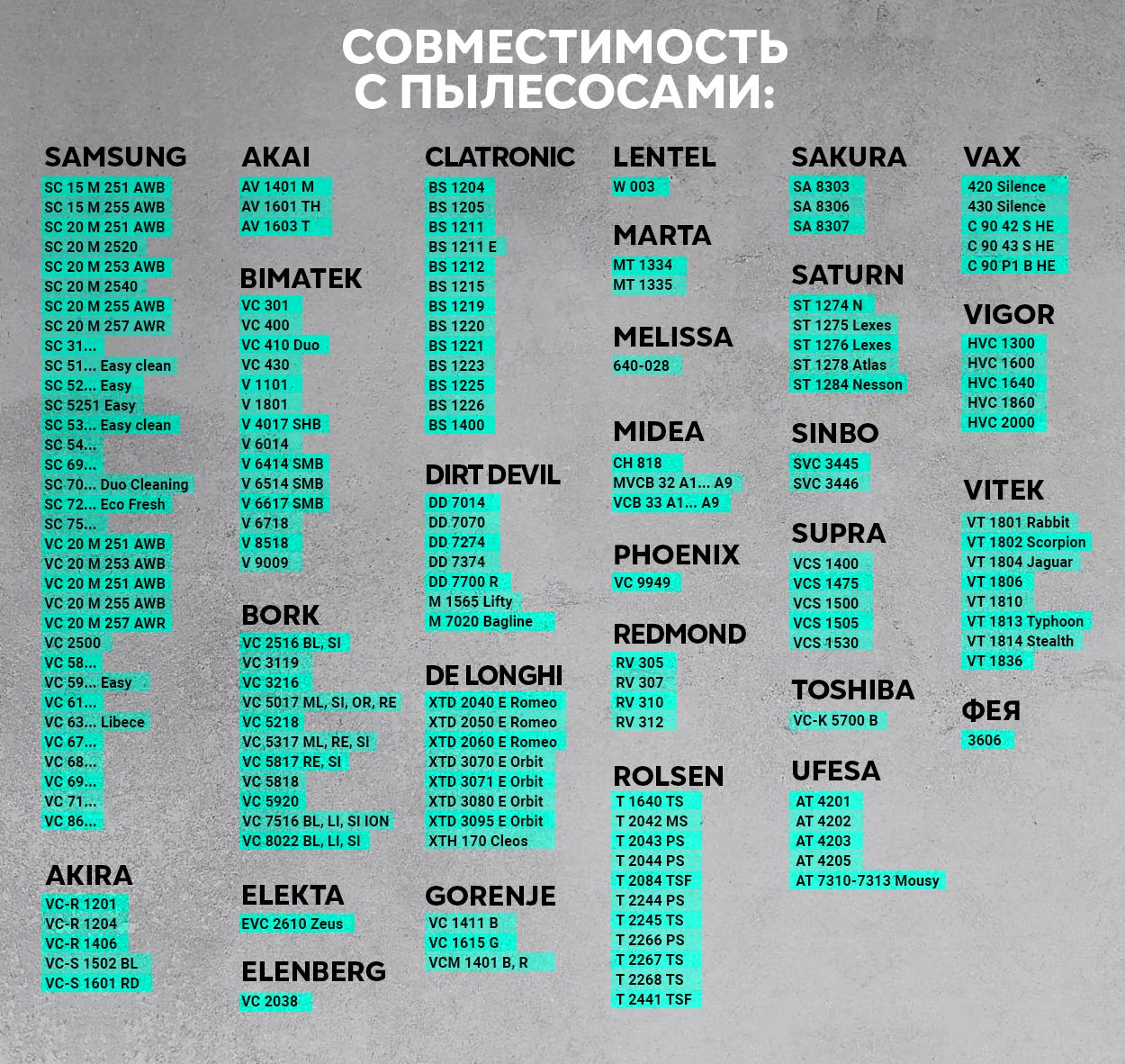 Мешки совместимы со всеми моделями пылесосов Sam, которые имеют тип мешка VP-95 или VP-95B. Наиболее популярные модели: изиклин, easy clean, vc2500, vc20m25, 1500, sc easy sc5491, vc 5853, vc20m251awb, sc5251,  sc20m257awr,  5252, vc-5853, vc5853, sc5241, sc 5241, самсунг sc, 5853, sc20m251awb, vc 7113h, sc 7025, sc7043, sc5491, sc5357, sc5150, sc5155, sc5241, sc5483.