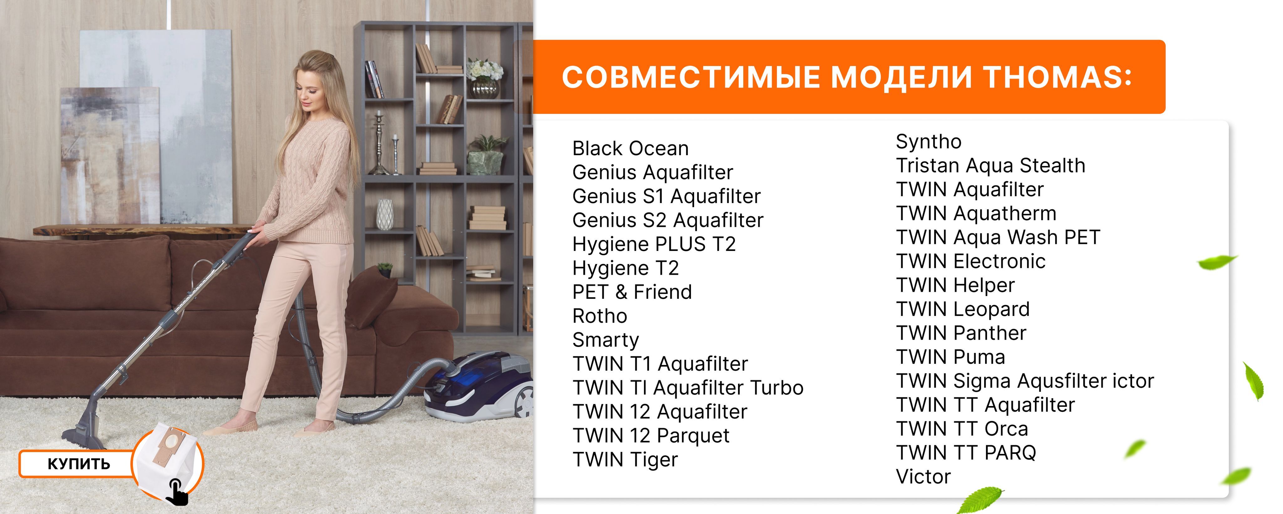 Описание: Высокая степень фильтрации Мешки-пылесборники с аквафильтром для моделей пылесоса Thomas. Вместительные и прочные с высоким уровнем очистки воздуха до 99.9%. Не снижают силу всасывания пылесоса на всём сроке использования. Пылесборник в пылесосе является важной частью, от которой зависит срок эксплуатации Вашей техники. Основные преимущества  Усиленная фильтрация за счет 5 слоев. Лучшее устранение запахов, по сравнению с фирменными мешками - 100% не пропускает неприятный запах. Плотное прилегание  В отличие от бумажных мешков-пылесборников их можно применять до полного наполнения, использовать как многоразовый мешок для пылесоса. Установите пылесборник в пылесос, а при полном заполнении замените на новый, не нужно вытряхивать пыль. Учитывайте при выборе, что мешок для пылесоса не универсальный. Совместимость  Подходят для пылесосов THOMAS   Hygiene Plus T2,Hygiene T2, Pet & Friend, TWIN Helper, TWIN T1 aquafilter, TWIN T2 aquafilter, TWIN TT aquafilter, TWIN TT PARQ, TWIN T2 PARQUET, TWIN aquafilter, TWIN aquatherm, GENIUS S1 aquafilter, GENIUS S2 aquafilter, GENIUS aquafilter, ROTHO, SYNTHO, VICTOR.  Хранить в сухом месте. С нашими мешками для пылесоса Вы сократите время уборки и освободите его для себя и семьи!