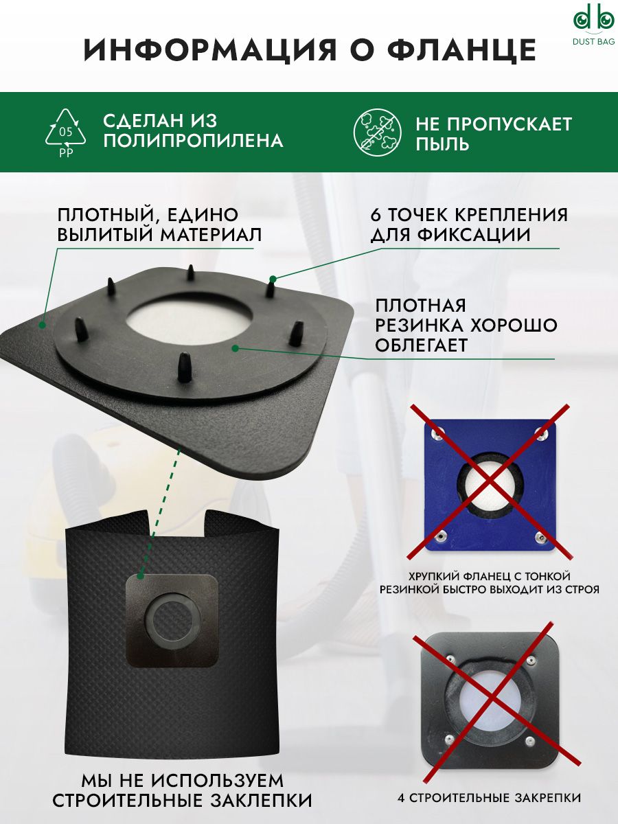 Инновационные технологии изготовления фланцев и специально разработанное 6-контактное крепление STRONGFIX пластиковой пластины к фильтрующему материалу. Уникальный антиаллергенный материал, благодаря которому не только задерживается мусор, но и воздух становится чище. Резинка плотно облегает патрубок пылесоса, поэтому сведен к минимуму риск срыва фланца с патрубка.