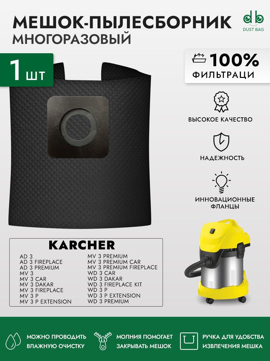 Описание: НОВИНКА! Многоразовый мешок для пылесоса на молнии европейского качества (ведь именно Европа – родина правильных пылесборников) бренда DUST BAG для пылесосов KARCHER серий WD3, AD3, MV3.