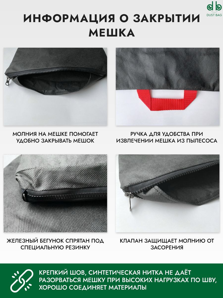 Всё это дает возможность пользоваться мешком пылесборником для пылесоса много раз и не бояться ни за свое здоровье, ни за работу вашего пылесоса. Ведь специальный клапан мешка защитит молнию от засорения, а железный бегунок прячется под специальную резинку, тем самым предохраняя бак вашего пылесоса от возможных повреждений.