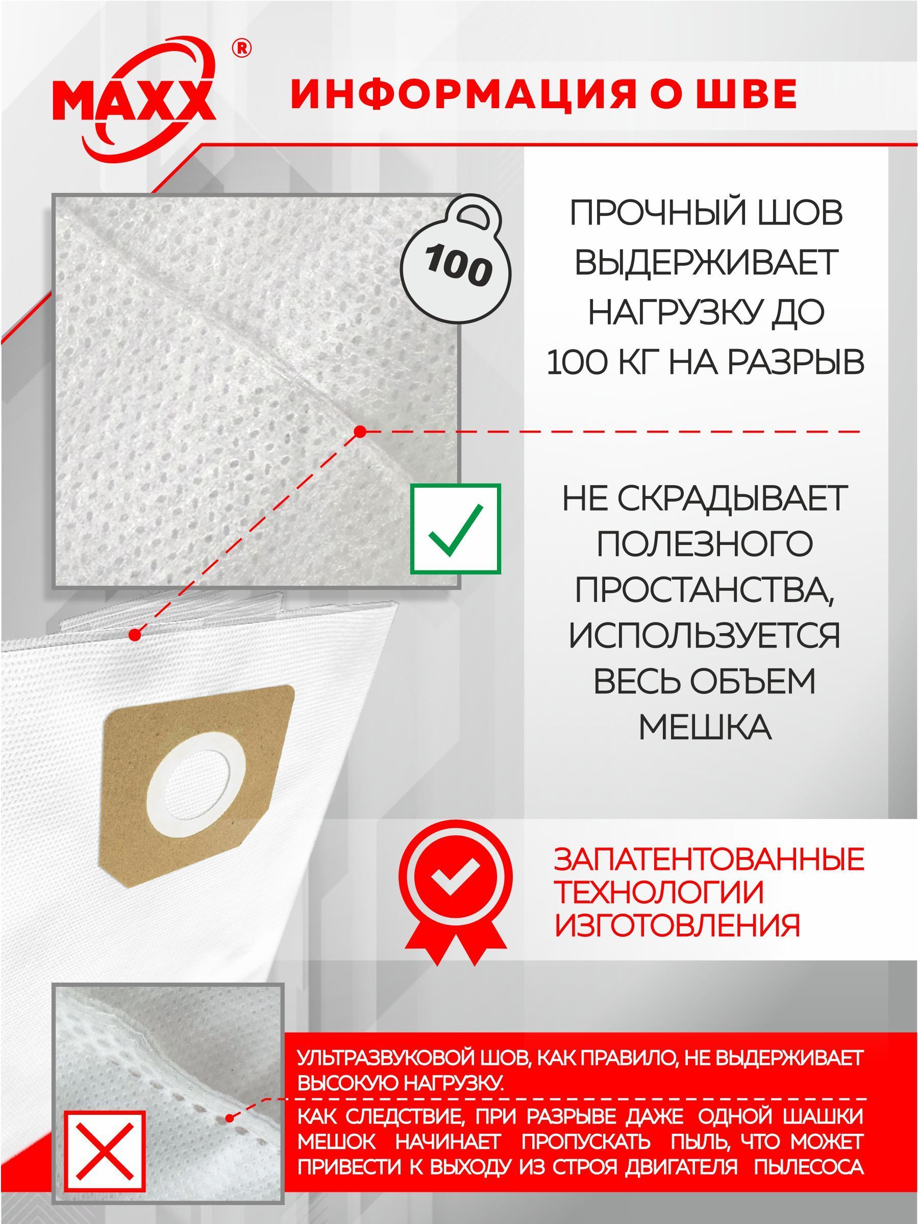 Мешок состоит из 3х слоев многослойного нетканого микроволокна, чем обеспечивается высокий уровень фильтрации за счет специально разработанного для бренда MAXX материала.