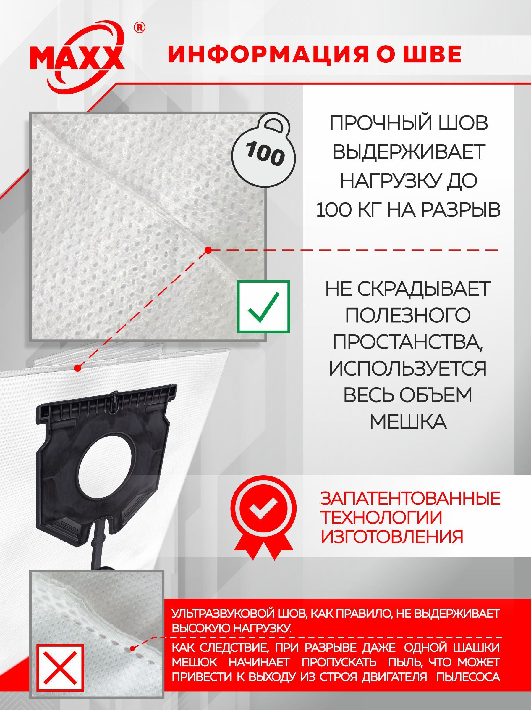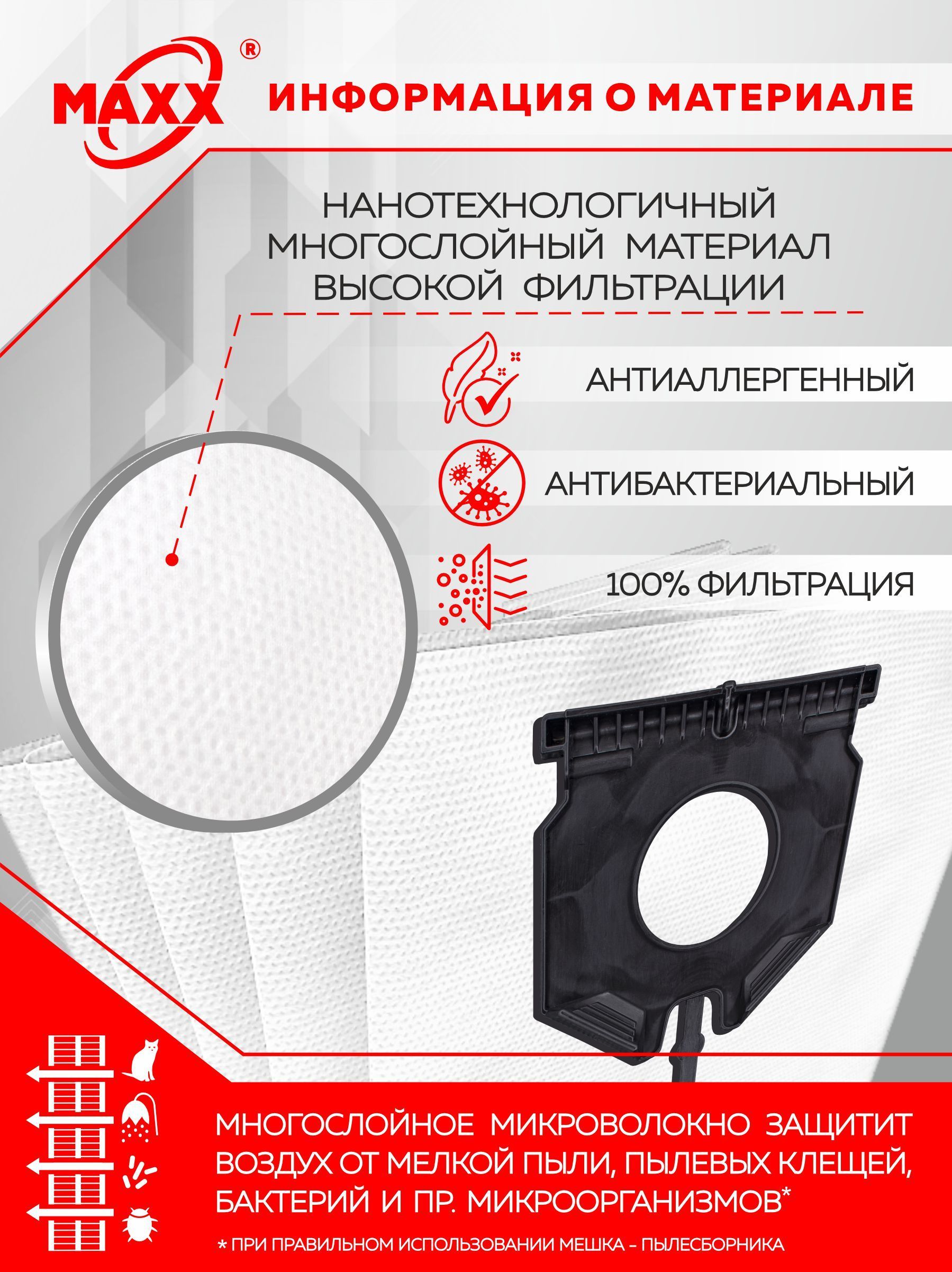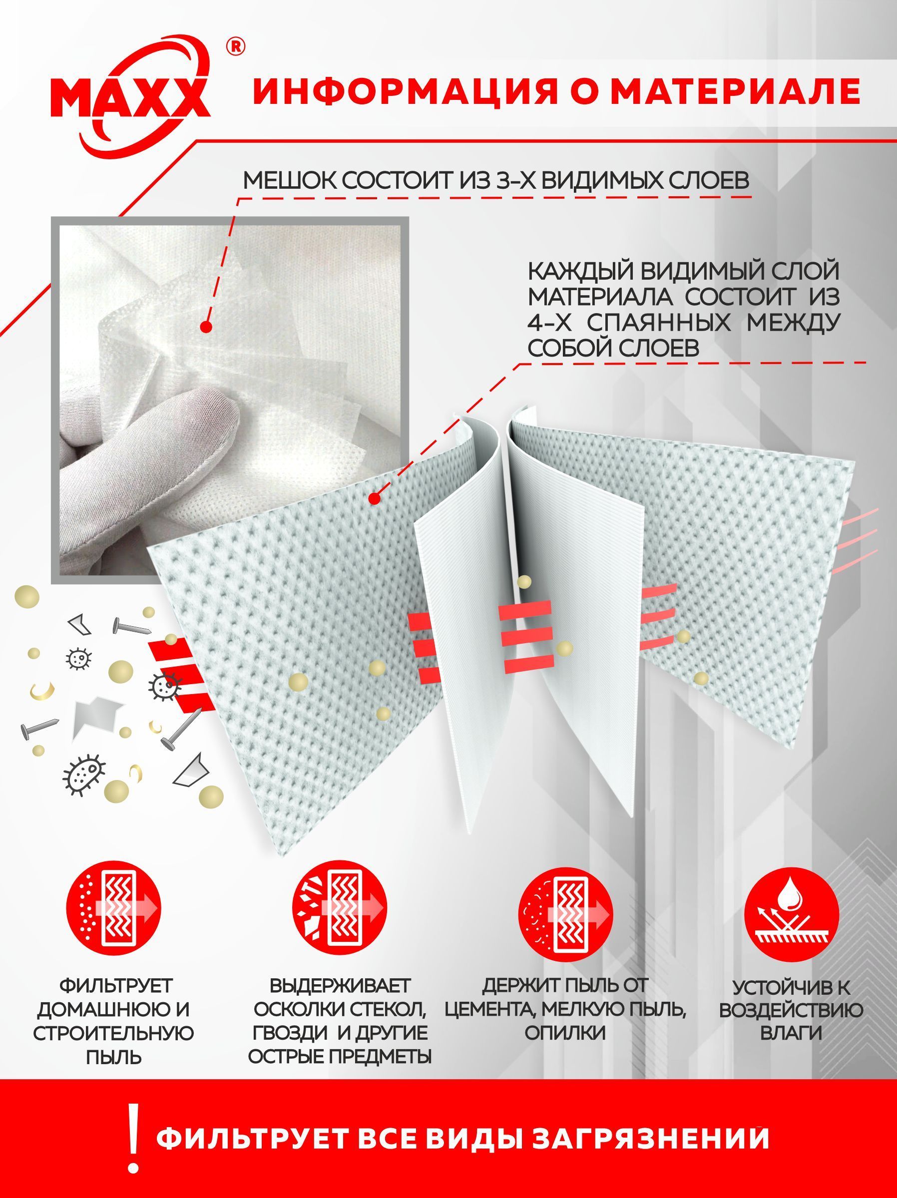Мешок состоит из 3х слоев многослойного нетканого микроволокна, чем обеспечивается высокий уровень фильтрации за счет специально разработанного для бренда MAXX материала.