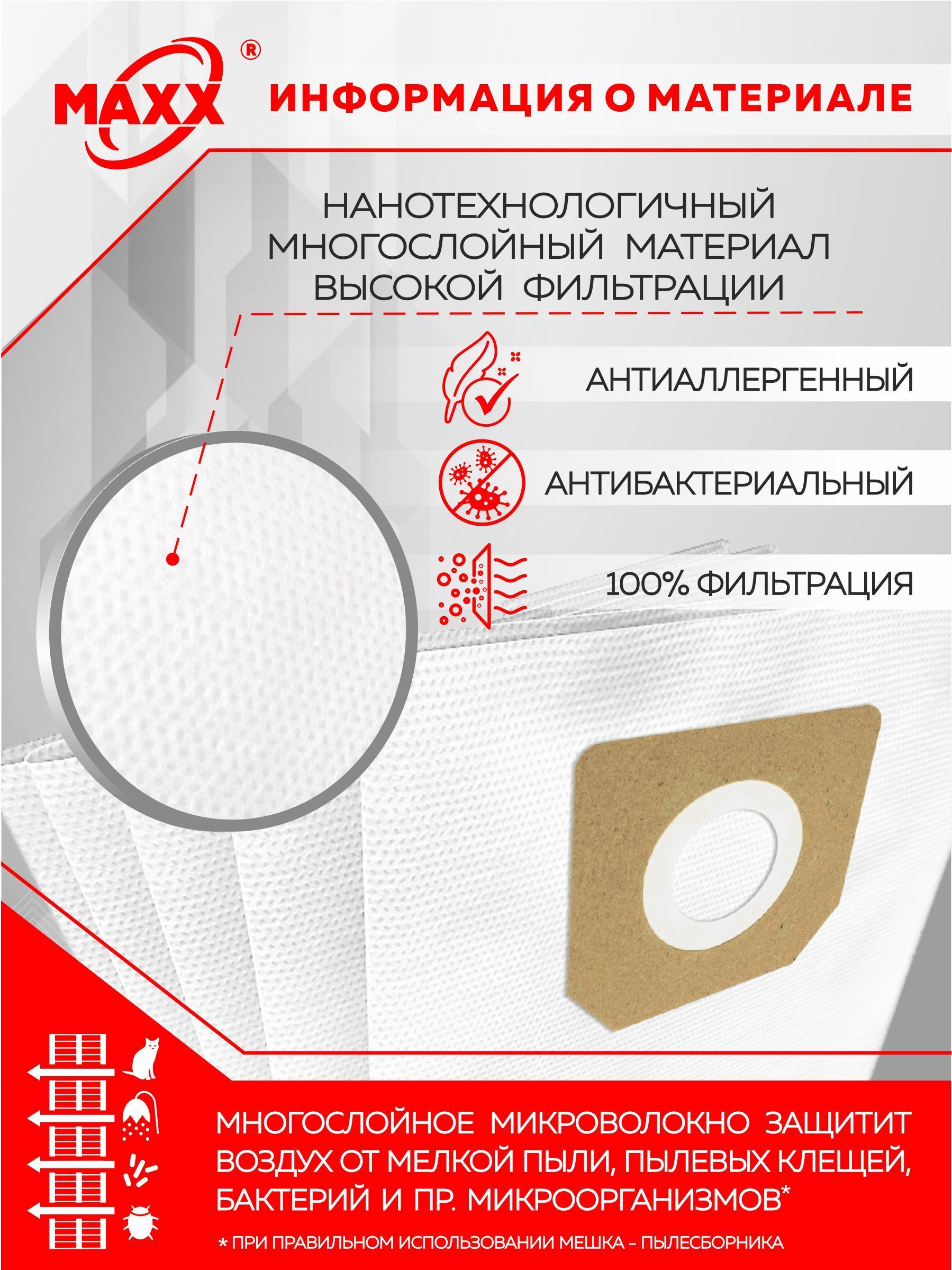 Мешок состоит из 3х слоев многослойного нетканого микроволокна, чем обеспечивается высокий уровень фильтрации за счет специально разработанного для бренда MAXX материала.