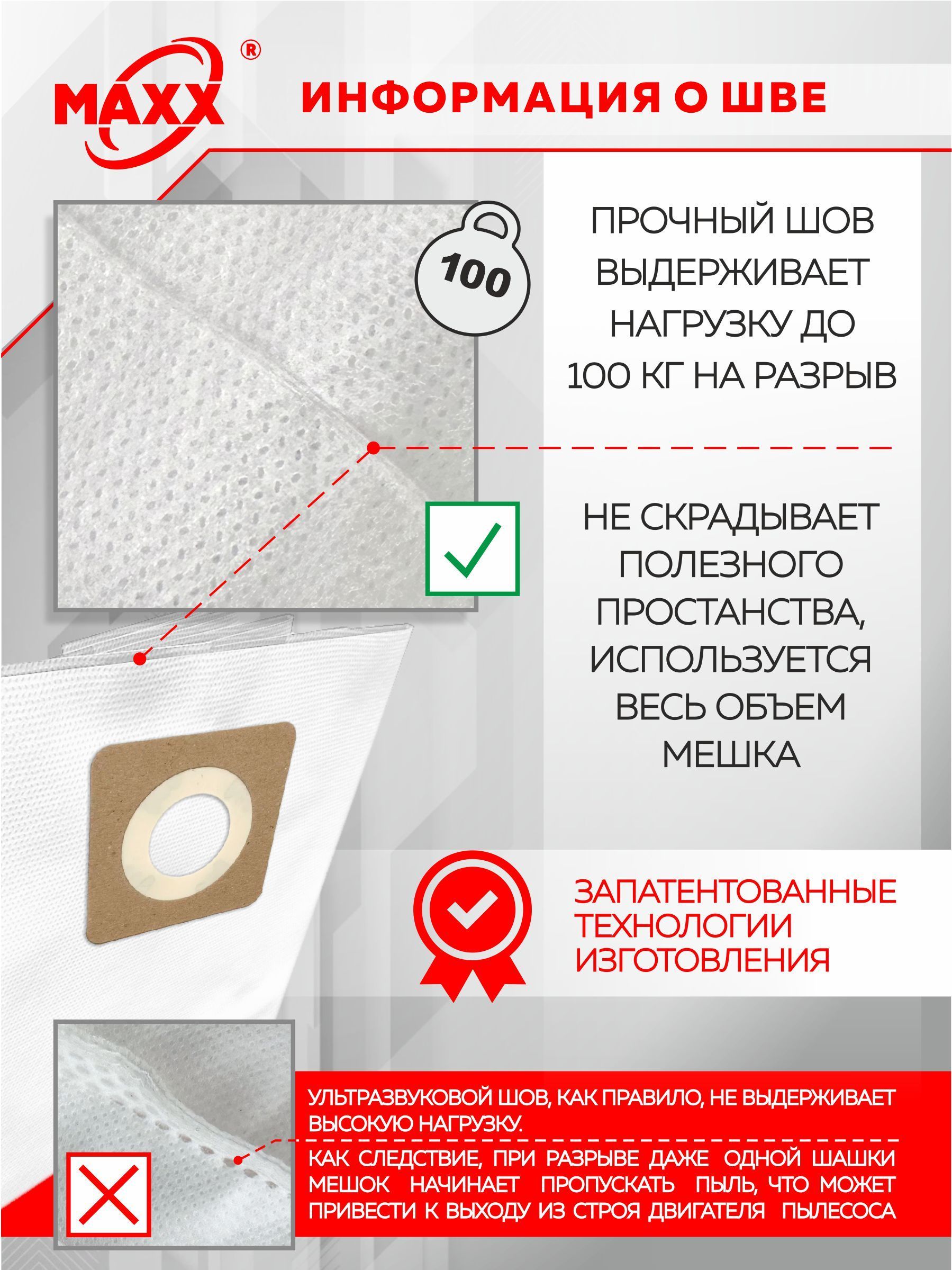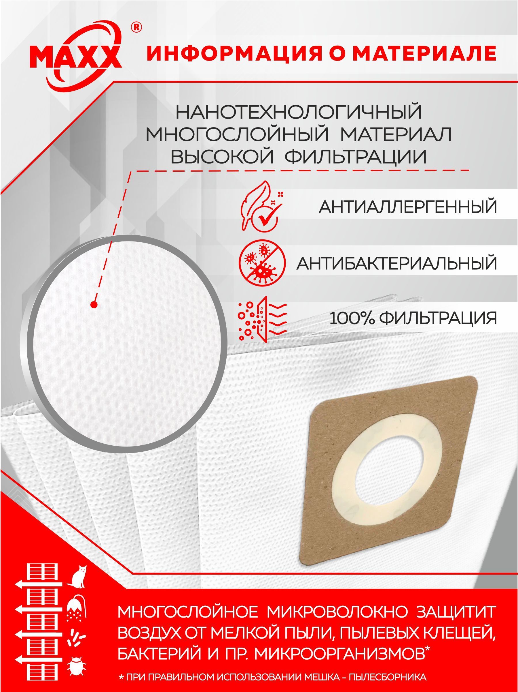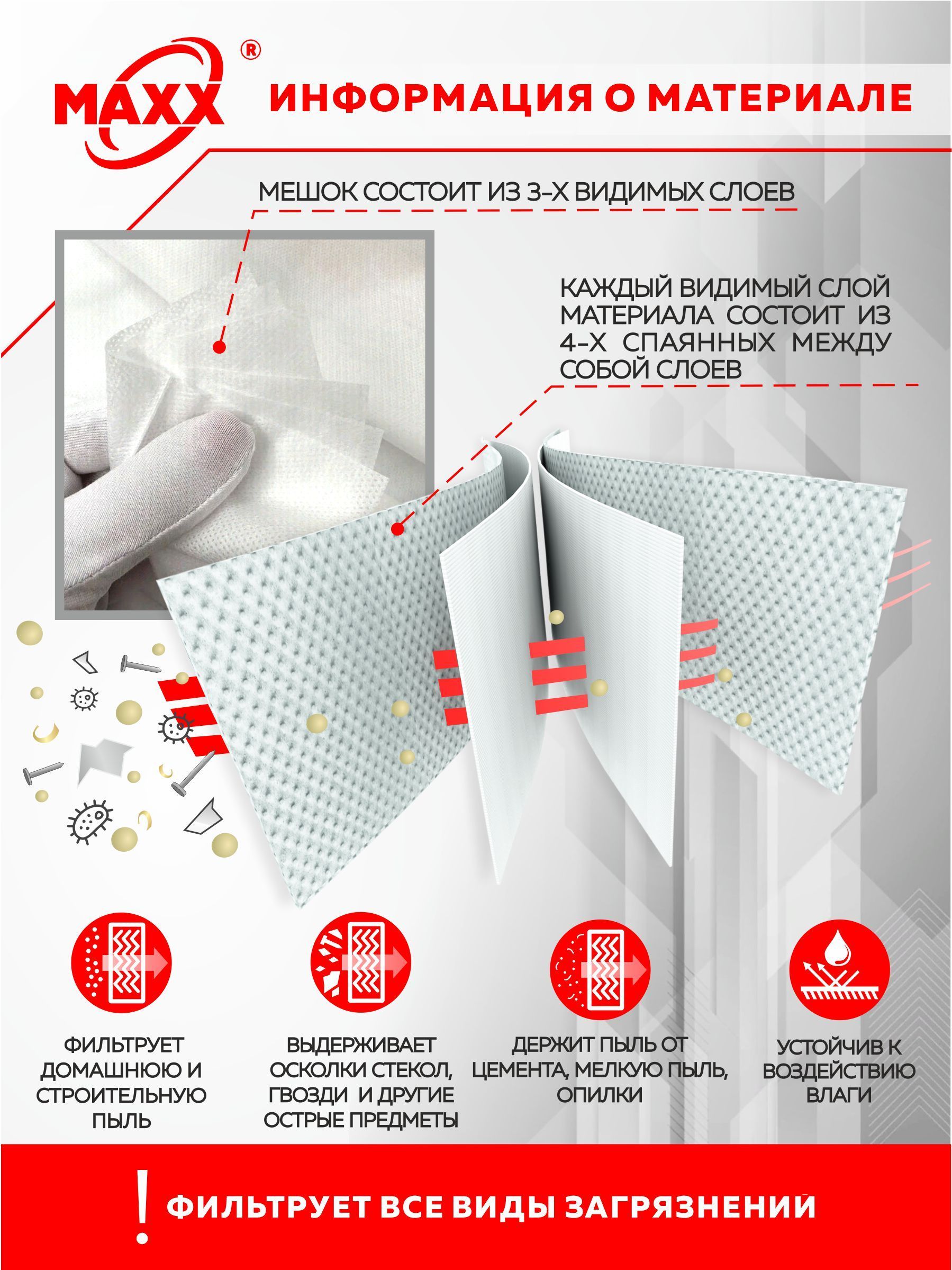 Мешок состоит из 3х слоев многослойного нетканого микроволокна, чем обеспечивается высокий уровень фильтрации за счет специально разработанного для бренда MAXX материала.