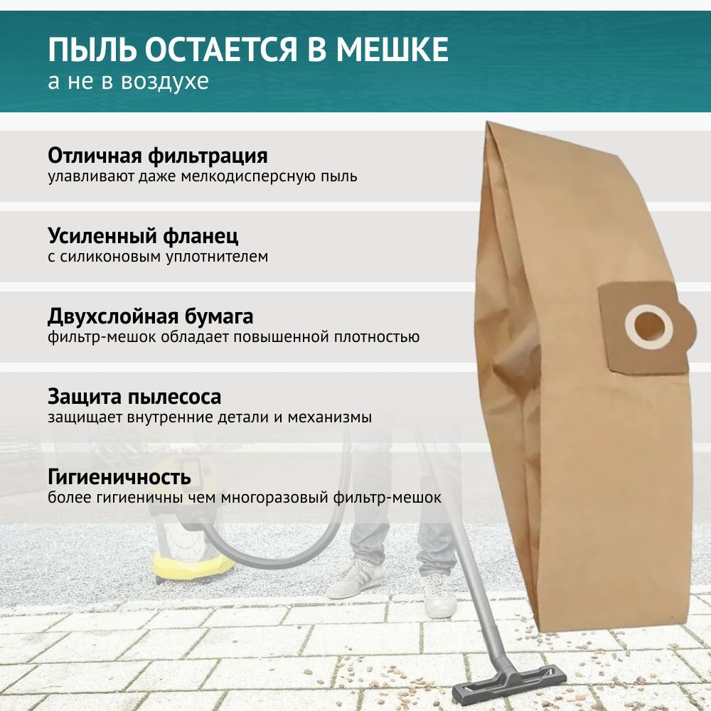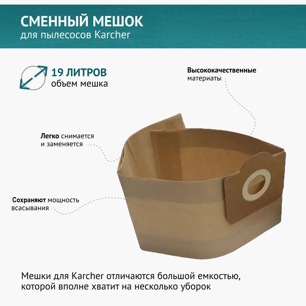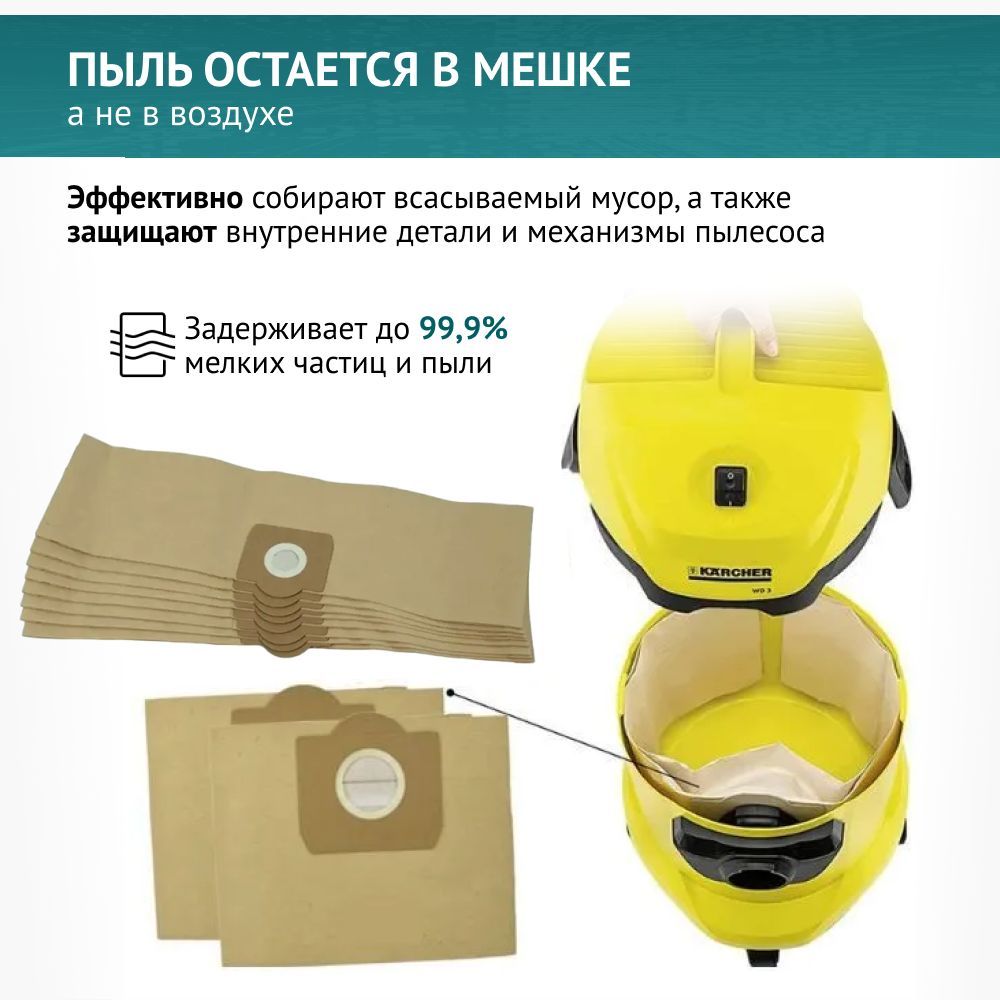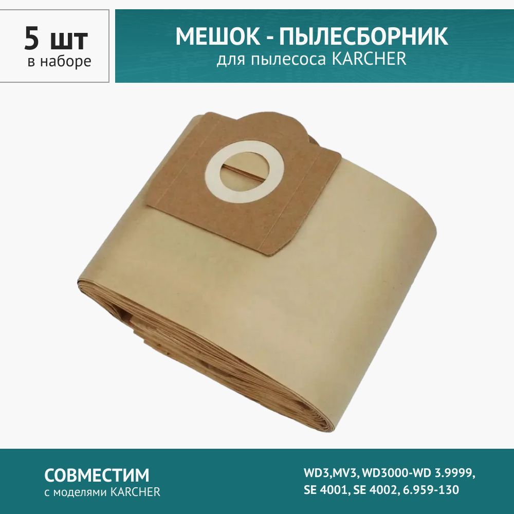 Комплект содержит 5 мешков и подходит для пылесосов Karcher: KARCHER WD3,MV3, WD3000-WD 3.9999, SE 4001, SE 4002, 6.959-130.