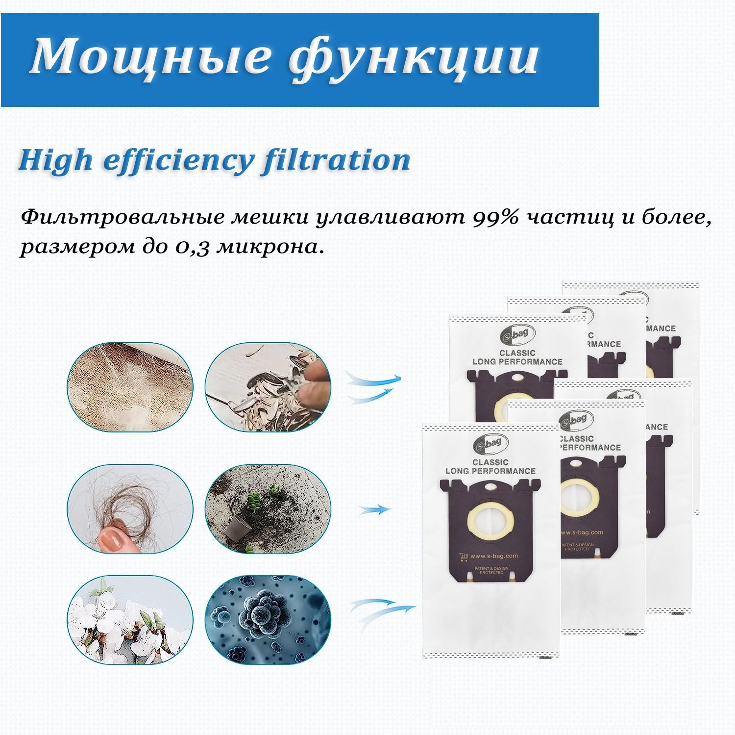 • Высокая способность фильтрации: синтетический материал мешка фильтрует до 99% частиц размером до 1 микрона (в 15 раз меньше диаметра человеческого волоса). Он фильтрует воздух на 40 % эффективнее, чем обычный бумажный мешок, и помогает избавиться от переносимых по воздуху частиц, таких как аллергены и некоторые виды бактерий.