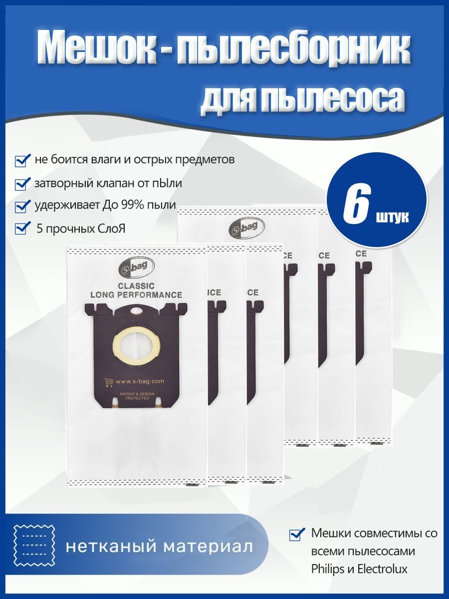 Мешок - пылесборник для пылесоса PHILIPS FC8021/03, ELECTROLUX AEG TORNADO VOLTA ZANUSSI, тип S-Bag - 6 шт