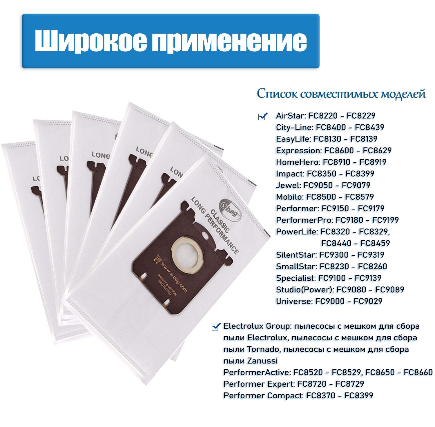 ELECTROLUX: Z5148, EL4100A, ZP3523, Z5900 - 5995, Z5025, EL7063A, ZV1010 - 1050, EL6984, XXLBOX1F - 16F, Z5241, XXLTT12, EL7085ADX, ZJM6840, XXLBOX12F, Z5120, ZJM6830, Z5035, EL7066A, EL7024, XXL2253, Z5235, ZUO8800 - 8899, Z7320 - 7399, ZP3520 2, XXL2272, XXL2254, ZPF2230, Z5048, EL7020, XXLTT14, EEQ10, ZT7770, Z5210, ZP3510, Z1900 - 2095, Z5225, ZP4020, ZUS3900 - 3990, Z5128, ТИП S-BAG, ZT7740, Z5230, ZPF2200, Z5130, Z5245, ZP3511, EL4101A, ZEG300, ZJM6811, XXLBOX3F, EL6985, ZVQ2100 - 2105, ZPF2210, Z5220, Z5500 - 5695, Z5240, XXLBOX4F, ZE2400, Z5030, ZT7750, Z5110, ZUSG3690, Z4500 - 4595, EL7080ACL, EL6986, ZVQ21…, ZEO5400 - 5499, EL4103A, Z6201, ZAM6100 - 6299, Z5041, ZJM68CUP, ZUS3300 - 3399, ZO6300 - 6399, Z5010, ZXM7010 - 7090, ZE300 - 395, ZJM6800 - 6899, ZE2200 - 2299, EEQ30, ZJM68SP, ZP4000, ZUSR21, ZUO90…, EL4040A, PD91-8SSM, ZEG301, ZJM2200, EL4200A, EEQ20, Z5045, ZUS4065, ZUO9928, ZPF2220, Z5028, ZP4010, Z5125, EUS89TM, ZJM68FD1 - 68FD9, ZUSG30, Z5141, EL7060A, Z6200, Z5248, XXL2271, Z7510 - 7549, ZP4001, XXLTT11, XXL00 - XXL301, Z5229, XXLBOX14F, EL7083ASG, ZUSG4061, EL7061A, ZE2410, Z5295, ZUS4061, Z5228, ZUSG3900 - 3990, ZJM6820, EL6988, ZUSG3000, ZP3525, ZCS2000 - 2590, Z5020, Z5135, Z5040BORK: V511, VC 9926, VC SBH 9118, VC SHB 9818, VC SBH 9818, VC SHB 9919, VC SHB 9118, VC SHB 9016, V510PHILIPS: FC8450, FC8454 - 8457, FC8434, FC9300 - 9319, FC8370 – 8401, FC9149 - 9199, FC8429, HR8300 - 8399, FC8443, FC8408, FC8432, FC9049 - 9089, FC8575 - 8593, FC8600 - 8619, FC8422, FC8130 - 8139, FC8444, FC8200 - 8260, FC8442, FC8650 - 8669, FC8320 - 8326, FC8293 - 8296, FC9000 - 9029, FC8430, FC9100 - 9139, FC8445, FC8520 - 8522, FC8397, FC8780, HR8500 - 8599, FC8433, FC8428, FC8452, FC8910 - 8919, FC9310 - 9319, FC8451, FC8526, FC8424, FC8425, FC8924 - 8925, FC8436 - 8440ARNICA: TERRA PREMIUM, TERRA PLUS BLUELINE, TERRA PLUS PINKLINE, TERRA ROSSO, TERRA BLU, TERRAAEG: AUS3901, AMX2000 - 2200, AE305SC, AEL8800 - 8899, AVC1220 - 1230, AEO5400 - 5499, AESG300, AVQ2101, ТИП GR 200, AUSG3901, AO7335, AUSO3000, AG8800, AUSG3930, AVQ2100 - 2141, AUS3965, AVC1100 - 1190, AJG6700, P1 - P999, ACSG000 - ACSG999, AO7350, AEC ..., AUS8230, AUS3966, AAM6217, AJM6800 - 6899, ACS1800, AUS4030 - 4090, AJM68FD1 - FD9, AAM6216, AUO8815 - 8870, AEL90, AEP3525, AXXLBOX18, AVQ2500, AUS3930, ACS000 - ACS999, AUO900273850, AOS9300 - 9352, AEP3515, AAM6100 - 6200, AVGPARKETO …, AES355, AAM7124, AAM6320, AO7320, AJG6800 - 6899, AUOGREEN ULTRAONE, ТИП S-BAG, 2221 QS, AAM6324, AUSG3900, AUOQUATTRO ULTRAONE STAUBSAUGER, AESG301, AUS3931, AE7300 - 7399, AVQ2220 - 2250 QS, AJM6717, AMX7010 - 7035TORNADO: TO6800 - TO6899 JET MAXX, TO6530/N, TO4625 ESSENSIO, TO5430 ESSENSIO, TO6300 - TO6399 CALYPSO, TO1500 - TO1800 BOLIDO, TO3515 CLARIO 2, TO6870 JET MAXX, TO7010 - TO7035 MAXIMUS, TO4605 ESSENSIO, TO6520 CALYPSO, TO6410 AIRMAX, TO6860 JET MAXX, TO6510 - TO6530 CALYPSO, TO5415 ESSENSIO, CA6200 - CA6230 MODELYS, TO4600 - TO4699 ESSENSIO, TO4500 - TO4595 BOLIDO, TO3600 34 PLUTO, TO5420 ESSENSIO, CA6240 MODELYS, TO7020 MAXIMUS, TO4620 ZEPHIR, TO6520/N, TO6521 CALYPSO, TO6600 - TO6630 ELEGANCE, TO6400 - TO6451 AIRMAX, MODELYS 4620, TO6440 AIRMAX, TO4610 ESSENSIO, TO4620 ESSENSIO, TO5410 ESSENSIO, TO3525 CLARIO 2, TO5400 - TO5499 ESSENSIO, TWINTECH 7750, TO4641 ZEPHIR, TO68FD1 - TO68FD9 JET MAXXVOLTA: U7520 MAXIMUS, U4430 QUICKSTOP, U6200 - U6299 MODELYS, U7500 - U7599 MAXIMUS, U4640 CONTROL, U7510 MAXIMUS, ТИП FC8021, U4620 CONTROL, U6410 - U6430 AIRMAX, U4630 CONTROL, U4440 QUICKSTOP, U4420 QUICKSTOP, U68FD1 - U68FD9 JETMAXX, U4400 - U4499 QUICKSTOP, U7540 MAXIMUS, U6220 MODELYS, U6800 - U6899 JETMAXX, U4500 - U4595 BOLIDOZANUSSI: ZAN3625, ZAN3610, ZAN4610, ZAN3629, ZAN3600 - ZAN3630, ZANT7770 PLUTO, ZAN4640, ZAN4620PRIVILEG: 158.096, 437.841, 661.349, 186.521, 101.313, 479.940, 258.921, 516.341, 356.887, 426.887, 101.352QUELLE: 258.921, 186.521, 426.887, 516.341, 158.096, 356.887, 661.349, 101.313, 437.841, 101.352, 479.940SATRAP: ASPIRA KING 1800HANSEATIC: 732.326OTTO: 732.326