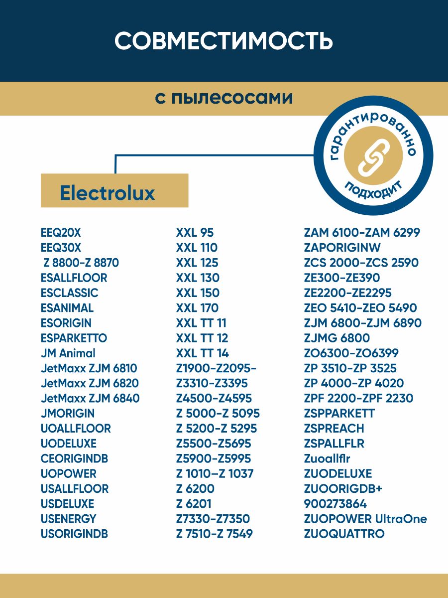• Совместимость фильтров (для упрощения поиска модели, откройте товар в браузере и с помощью команды CTRL+F вбейте модель пылесоса):Electrolux EEQ20X, Electrolux EEQ30X, Electrolux Z 8800-Z 8870, Electrolux ESALLFLOOR, Electrolux ESCLASSIC, Electrolux ESANIMAL, Electrolux ESORIGIN, Electrolux ESPARKETTO, Electrolux JM Animal, Electrolux JetMaxx ZJM 6810, Electrolux JetMaxx ZJM 6820, Electrolux JetMaxx ZJM 6840, Electrolux JMORIGIN, Electrolux UOALLFLOOR, Electrolux UODELUXE, Electrolux CEORIGINDB, Electrolux UOPOWER, Electrolux USALLFLOOR, Electrolux USDELUXE, Electrolux USENERGY, Electrolux USORIGINDB, Electrolux XXL 95, Electrolux XXL 110, Electrolux XXL 125, Electrolux XXL 130, Electrolux XXL 150, Electrolux XXL 170, Electrolux XXL TT 11, Electrolux XXL TT 12, Electrolux XXL TT 14, Electrolux Z1900-Z2095, Electrolux Z3310-Z3395, Electrolux Z4500-Z4595, Electrolux Z 5000-Z 5095, Electrolux Z 5200-Z 5295, Electrolux Z5500-Z5695, Electrolux Z5900-Z5995, Electrolux Z 1010–Z 1037, Electrolux Z 6200, Electrolux Z 6201, Electrolux Z7330-Z7350, Electrolux Z 7510-Z 7549, Electrolux ZAM 6100-ZAM 6299, Electrolux ZAPORIGINW, Electrolux ZCS 2000-ZCS 2590, Electrolux ZE300-ZE390, Electrolux ZE2200-ZE2295, Electrolux ZEO 5410-ZEO 5490, Electrolux ZJM 6800-ZJM 6890, Electrolux ZJMG 6800, Electrolux ZO6300-ZO6399, Electrolux ZP 3510-ZP 3525, Electrolux ZP 4000-ZP 4020, Electrolux ZPF 2200-ZPF 2230, Electrolux ZSPPARKETT, Electrolux ZSPREACH, Electrolux ZSPALLFLR, AEG P1 - P999, AEG AVC 1131-AVC 1170, AEG AVQ 2112, AEG AVQ 2113, AEG Ultra Tyger, AEG VCEK 4180, BORK VC 9016, BORK VC 9926, Bork V510, Bork V511, ZANUSSI ZAN 3600, ZANUSSI ZAN 3610, Zanussi ZAN 3625, ZANUSSI ZAN 4610, Zanussi ZAN 4620, Zanussi ZAN 4640, Philips FC8130-FC8139, Philips FC8200-FC8219, Philips FC8380-FC8389, Philips FC8390-FC8399, Philips FC8400-FC8449, Philips FC8450-FC8459, Philips FC8580-FC8589, Philips FC8600-FC8629, Philips FC8650-FC8669, Philips FC8900-FC8919, Philips FC9000-FC9049, Philips FC9050-FC9079, Philips FC9080-FC9089, Philips FC9100-FC9130, Philips FC9150-FC9179, Philips FC9180-FC9199, Philips FC9300-FC9319, Philips HR8300-HR8349, Philips HR8350-HR8399, Philips HR8368-HR8399, Philips HR8500-HR8599, Electrolux Zuoallflr, Electrolux ZUODELUXE, Electrolux ZUOORIGDB+ 900273864, Electrolux ZUOPOWER UltraOne, Electrolux ZUOQUATTRO, Electrolux ZUS3000–ZUS3388