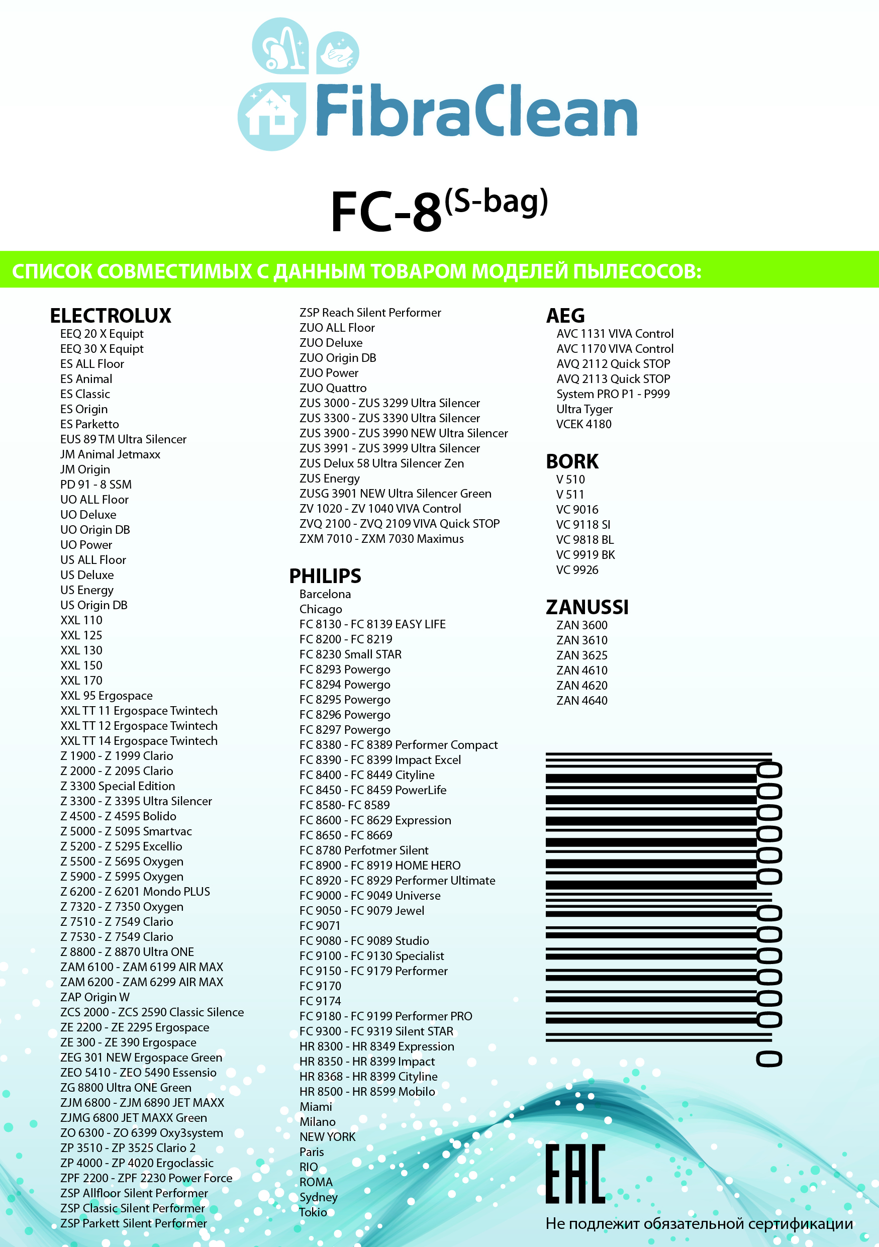 ELECTROLUX EEQ 20 X Equipt, EEQ 30 X Equipt ES All Floor, ES Animal, ES Classic, ES Origin, ES Parketto JM Animal JetMaxx, JM Origin UO All Floor, UO Deluxe, UO Origin DB, UO Power US All Floor, US Deluxe, US Energy, US Origin DB XXL 95 Ergospace, XXL 110, XXL 125, XXL 130, XXL 150, XXL 170 XXL TT 11 Ergospace Twintech XXL TT 12 Ergospace Twintech XXL TT 14 Ergospace Twintech Z 1900 - Z 2095 Clario Z 3300 Special Edition Z 3300 - Z 3395 Ultra Silencer например: Z 3353 Ultra Silencer Z 4500 - Z 4595 Bolido Z 5000 - Z 5095 Smartvac Z 5200 - Z 5295 Excellio например: Z 5225 Excellio Z 5500 - Z 5695 Oxygen Z 5900 - Z 5995 Oxygen Z 6200 - Z 6201 Mondo Plus Z 7320 - Z 7350 Oxygen Z 7510 - Z 7549 Clario Z 8800 - Z 8870 Ultra One например: ZG 8800 Ultra One Green ZAM 6100 - ZAM 6299 Air Max ZAP Origin W ZCS 2000 - ZCS 2590 Classic Silence ZE 300 - ZE 390 Ergospace например: ZEG 301 New Ergospace Green ZE 2200 - ZE 2295 Ergospace ZEO 5410 - ZEO 5490 Essensio ZJM 6800 - ZJM 6890 Jet Maxx например: ZJM 68 FD 1 Jet Maxx ZJMG 6800 Jet Maxx Green ZO 6300 - ZO 6399 Oxy3system ZP 3510 - ZP 3525 Clario 2 ZP 4000 - ZP 4020 Ergoclassic ZPF 2200 - ZPF 2230 Power Force например: ZPF 2220 Power Force ZSP Classic Silent Performer ZSP Parkett Silent Performer ZSP Reach Silent Performer ZSP AllFloor Silent Performer ZUO All Floor, ZUO Deluxe, ZUO Origin DB, ZUO Power, ZUO Quattro, ZUS 3000 - ZUS 3388 Ultra Silencer например: ZUS 3387 Ultra Silencer ZUS 3900 - ZUS 3999 Ultra Silencer ZUSG 3901 New Ultra Silencer Green ZV 1020 - ZV 1040 Viva Control ZVQ 2100 - ZVQ 2109 Viva Quick Stop ZXM 7010 - ZXM 7030 MAXimus например: ZXM 7020 MAXimus; PHILIPS FC 8130 - FC 8139 Easy Life FC 8200 - FC 8219 FC 8230 Small Star FC 8380 - FC 8389 Impact Plus FC 8390 - FC 8399 Impact Excel например: FC 8396 FC 8400 - FC 8449 Cityline FC 8450 - FC 8459 FC 8580- FC 8589 например: FC 8588 Performer Active FC 8600 - FC 8629 Expression например: FC 8604 Expression FC 8650 - FC 8669 FC 8900 - FC 8919 Home Hero FC 9000 - FC 9049 Universe FC 9050 - FC 9079 Jewel FC 9080 - FC 9089 Studio FC 9100 - FC 9130 Specialist например: FC 9102 Specialist Reach & Clean FC 9150 - FC 9179 Performer FC 9180 - FC 9199 Performer Pro FC 9300 - FC 9319 Silent Star например: FC 9302 Silent Star HR 8300 - HR 8349 Expression HR 8350 - HR 8399 Impact HR 8368 - HR 8399 Cityline HR 8500 - HR 8599 Mobilo например: HR 8572 Mobilo Plus; AEG P1 - P 999 Sistem Pro, AVC 1131 - AVC 1170 Viva Control, AVQ 2112, AVQ 2113 Quick Stop, Ultra Tyger, VCEK 4180; BORK VC 9016, VC 9118 Sl, VC 9818 Bl, VC 9919 Bk , VC 9926, V 510, V 511; ZANUSSI ZAN 3600, ZAN 3610, ZAN 3625 ZAN 4610, ZAN 4620, ZAN 4640