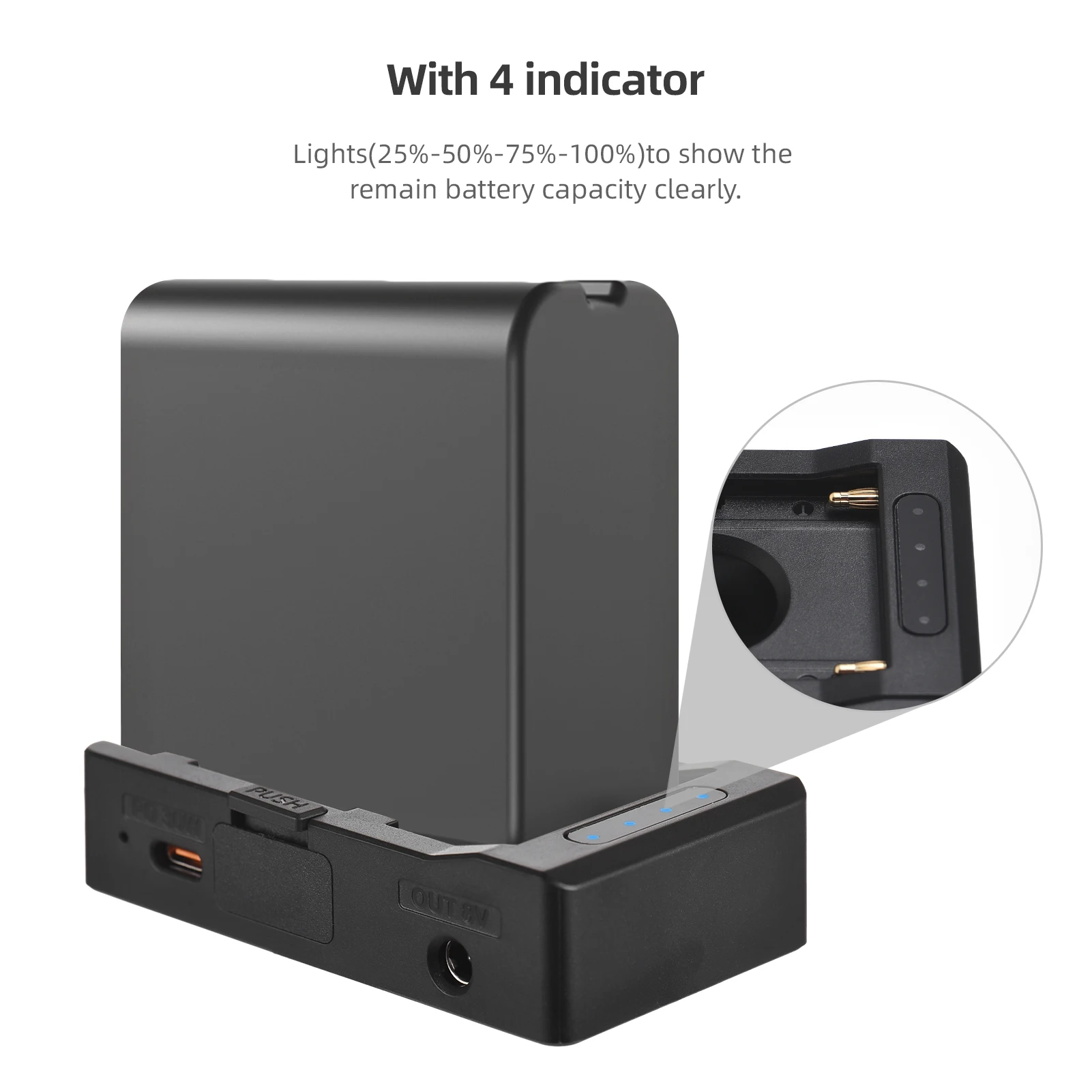 С 4 световыми индикаторами (25%-50%-75%), чтобы четко показать оставшую емкость аккумулятора.