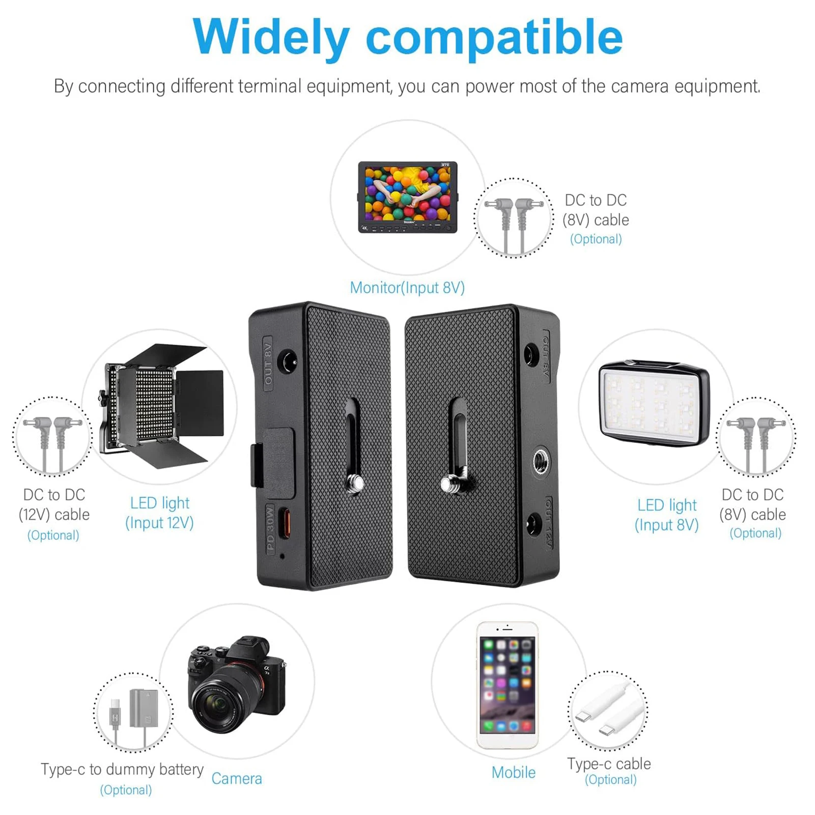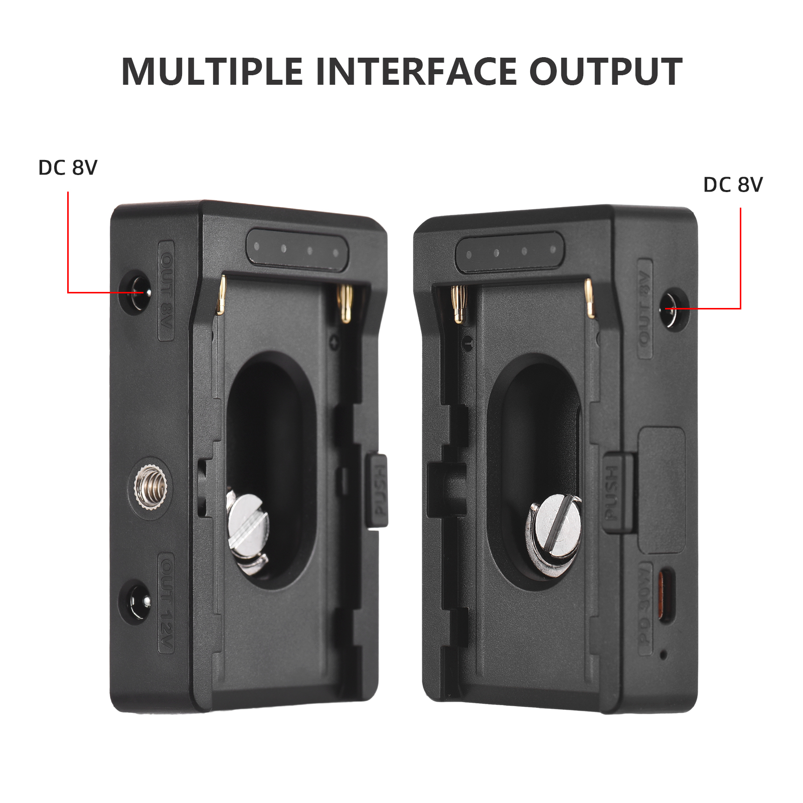 С выходами DC12V, DC8V и USB-C, что позволяет удобно питать камеры DSLR/ ILDC/ BMPCC от NP-F батареи.
