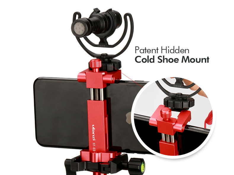 • Скрытое крепление для холодного башмака---- С запатентованной скрытой конструкцией крепления для холодного башмака вы можете установить видеомикрофон и светодиодную видеолампу или Gopro на верхнюю часть крепления для телефона.