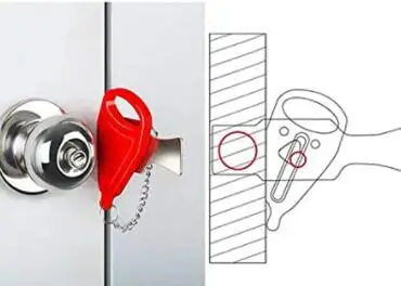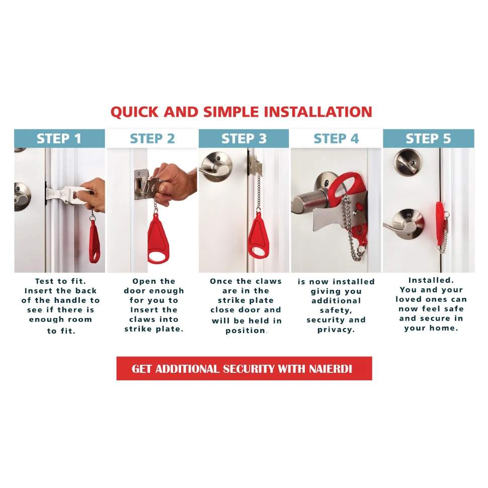 2. ПРОСТОТА ИСПОЛЬЗОВАНИЯ-Этот Дверной замок легко установить или снять, его можно установить за секунды без каких-либо инструментов даже в чрезвычайных ситуациях и в темноте. Просто вставьте металлическую деталь в прорезь дверного замка, закройте дверь, а затем приложите красный паз ручки к шпильке на металлическом листе, тогда никто не сможет открыть дверь снаружи.