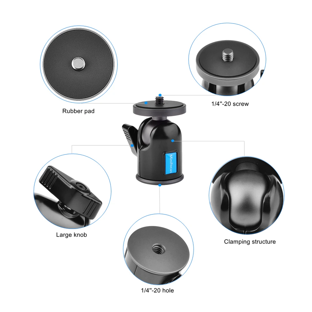 1. 【Широкая совместимость】 Оснащен винтом 1/4 дюйма, подходящим для большинства цифровых зеркальных, беззеркальных, экшн-камер, видеокамер, фотоаппаратов или других фотоаппаратов со стандартным отверстием с резьбой 1/4 дюйма. Отверстие с резьбой 1/4 дюйма внизу можно прикрепить к штативу, моноподу, направляющей слайдера, осветительной подставке и т. Д.