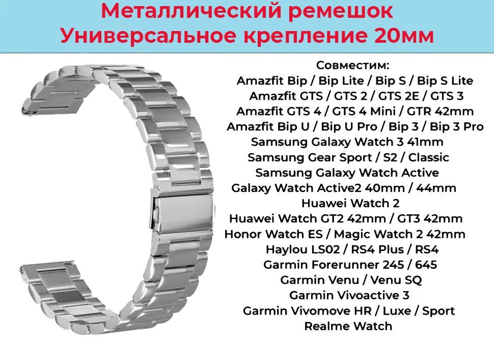 1.) Блочный металлический ремешок из нержавеющей стали (Серебристый) для смарт-часов с шириной крепления 20мм 2.) Быстросъемные шпильки (штифты) для крепления к часам - 2 штуки 3.) Индивидуальная упаковка
