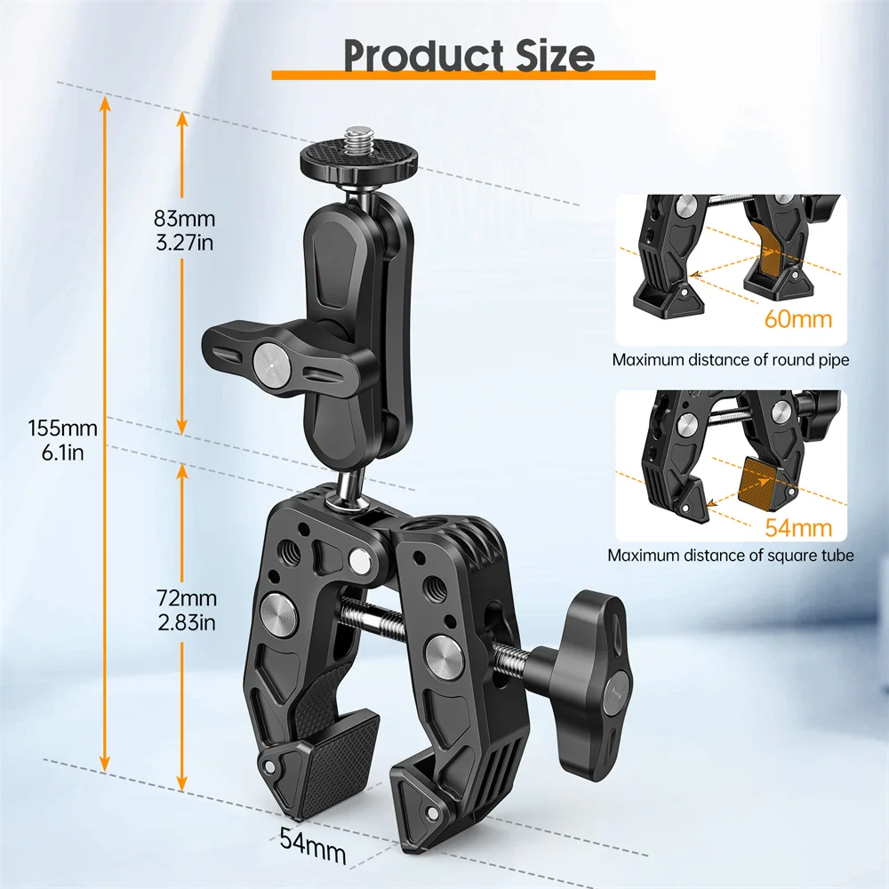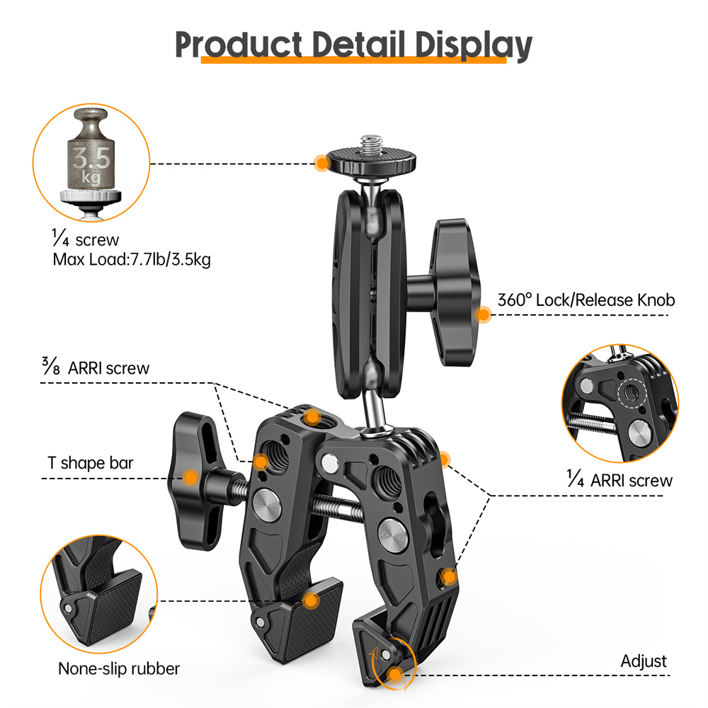 • 【Новейшее крепление для экшн-камеры】 Это зажимное крепление для камеры на 360 ° предназначено для студийной видеосъемки. Максимальное открытое расстояние нижнего зажима составляет 60 мм; Наилучшие нагрузки-7,7 фунта (3,5 кг)-последнее обновление.
