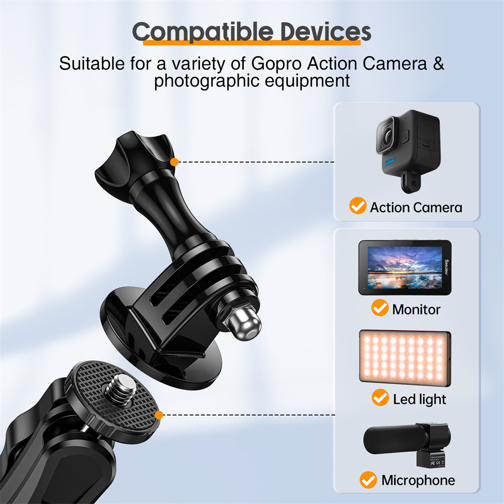 • 【Стандартная внутренняя резьба 1/4 ''и 3/8'' 】 Внутренняя резьба 1/4 ''и 3/8'' на задней стороне зажима помогает установить небольшую камеру, монитор, светодиодную видеолампу, микрофон, вспышку Speedlite, и многое другое. Он также совместим с GoPro, это адаптер для тройного крепления камеры GoPro-Адаптер GoPro в комплект не входит.