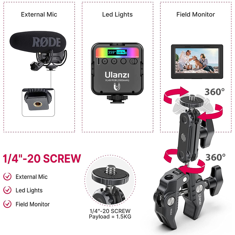 1.Multi-Functional Super Clamp with Ballhead is a multifunctional double ball head with a clamp at the bottom and a 1/4" screw on the top.