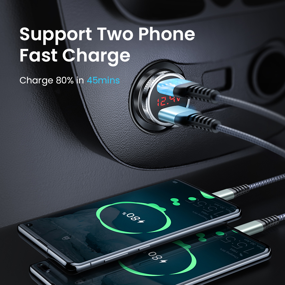 Металлическое автомобильное зарядное устройство QC 3,0 с двумя USB-портами, светодиодный цифровой дисплей для iPhone, Xiaomi, Samsung, Huawei, быстрая зарядка, контроль напряжения