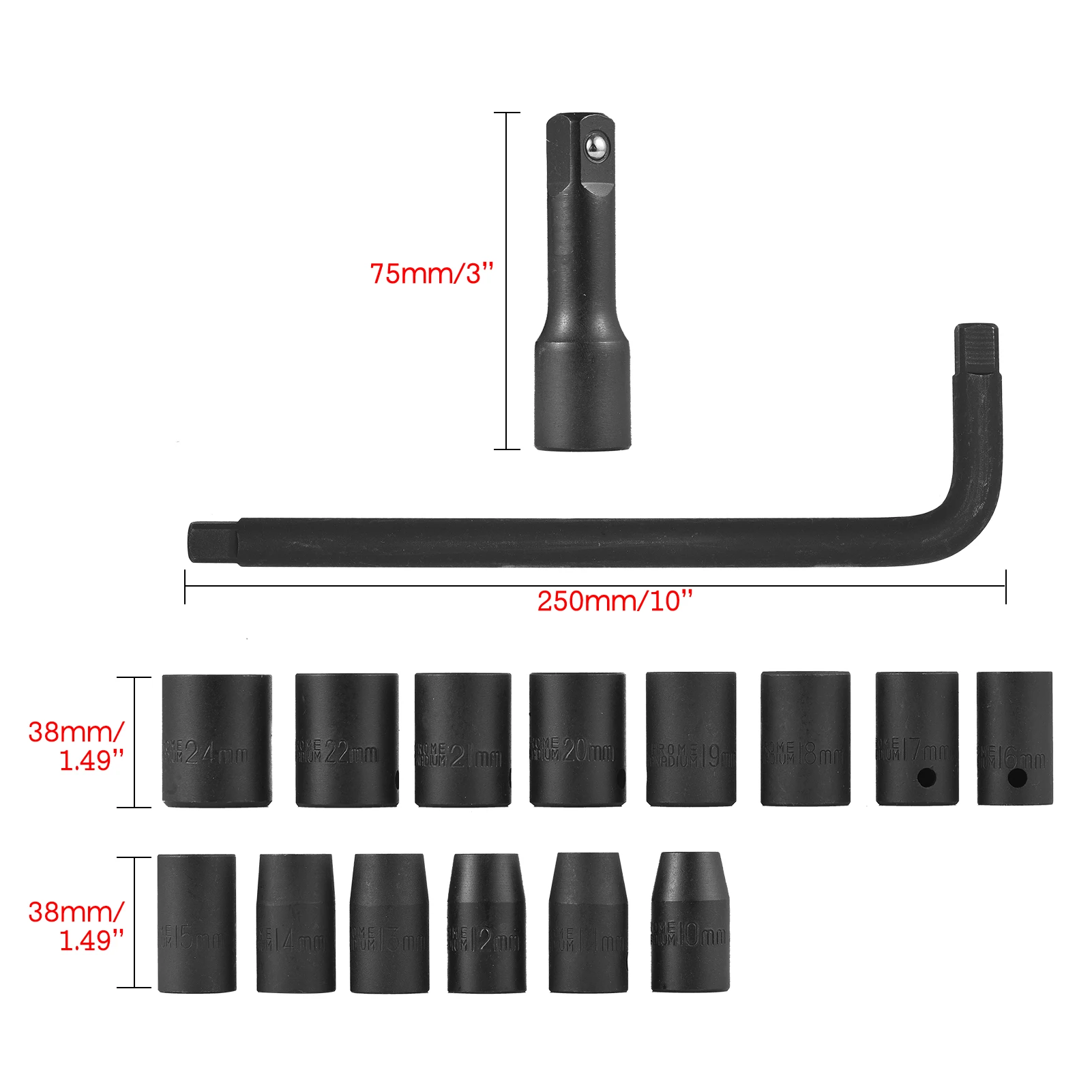 ПОЛНЫЙ КОМПЛЕКТ из 20 ЧАСТЕЙ: Включая гнезда 9-24 мм для повседневного технического обслуживания. Оснащен удлинениями 3, 5, 10 дюймов для доступа к глубоким резьбовым отверстиям. Адаптер позволяет использовать втулку с электрическим ключом 3/8.
