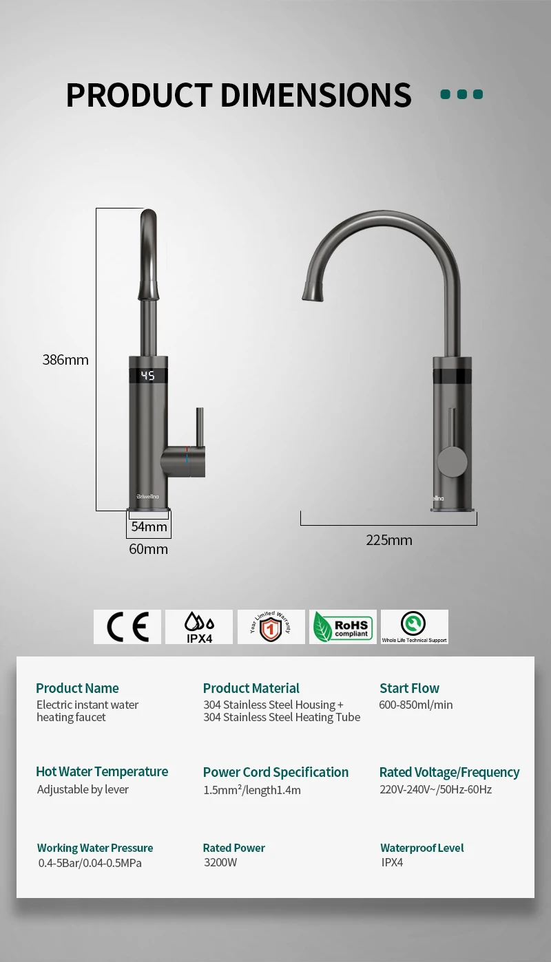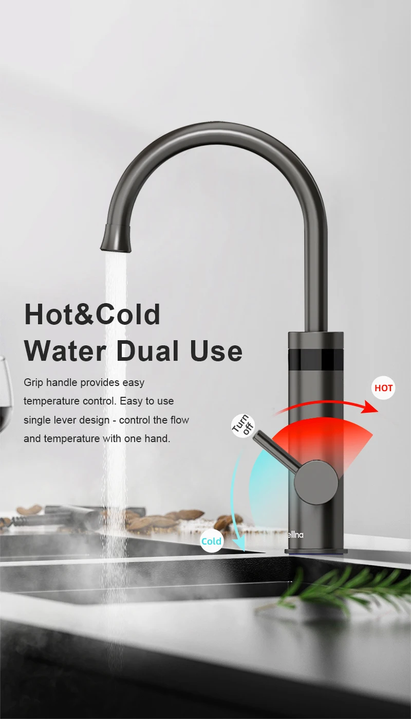 Fast Heating Tap With the stainless steel heating tube of 3300W, water can be heated in few seconds without waiting too long. NOTE: The thinner the water flow, the higher the temperature.