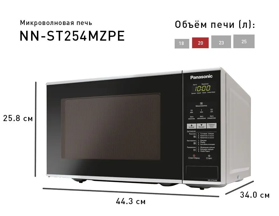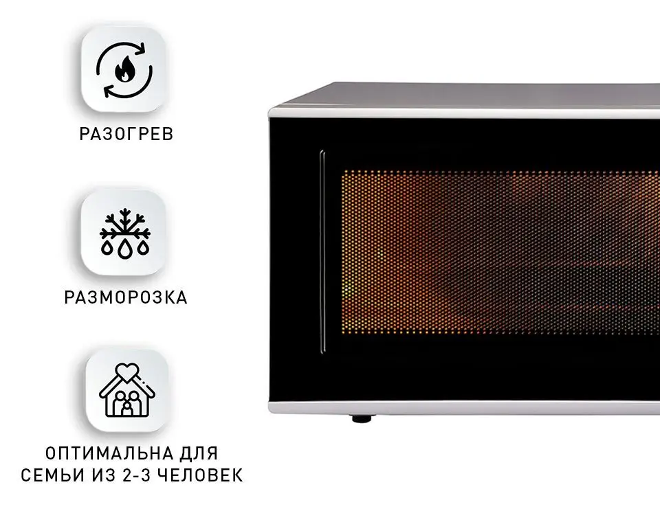 Современная и компактная микроволновая печь изменит ваше представление о готовке. Внутренний объем 20 л позволяет готовить блюда, разогревать или размораживать продукты для всей семьи. Благодаря поворотному столу диаметром 255 мм, вы сможете использовать посуду различного размера.