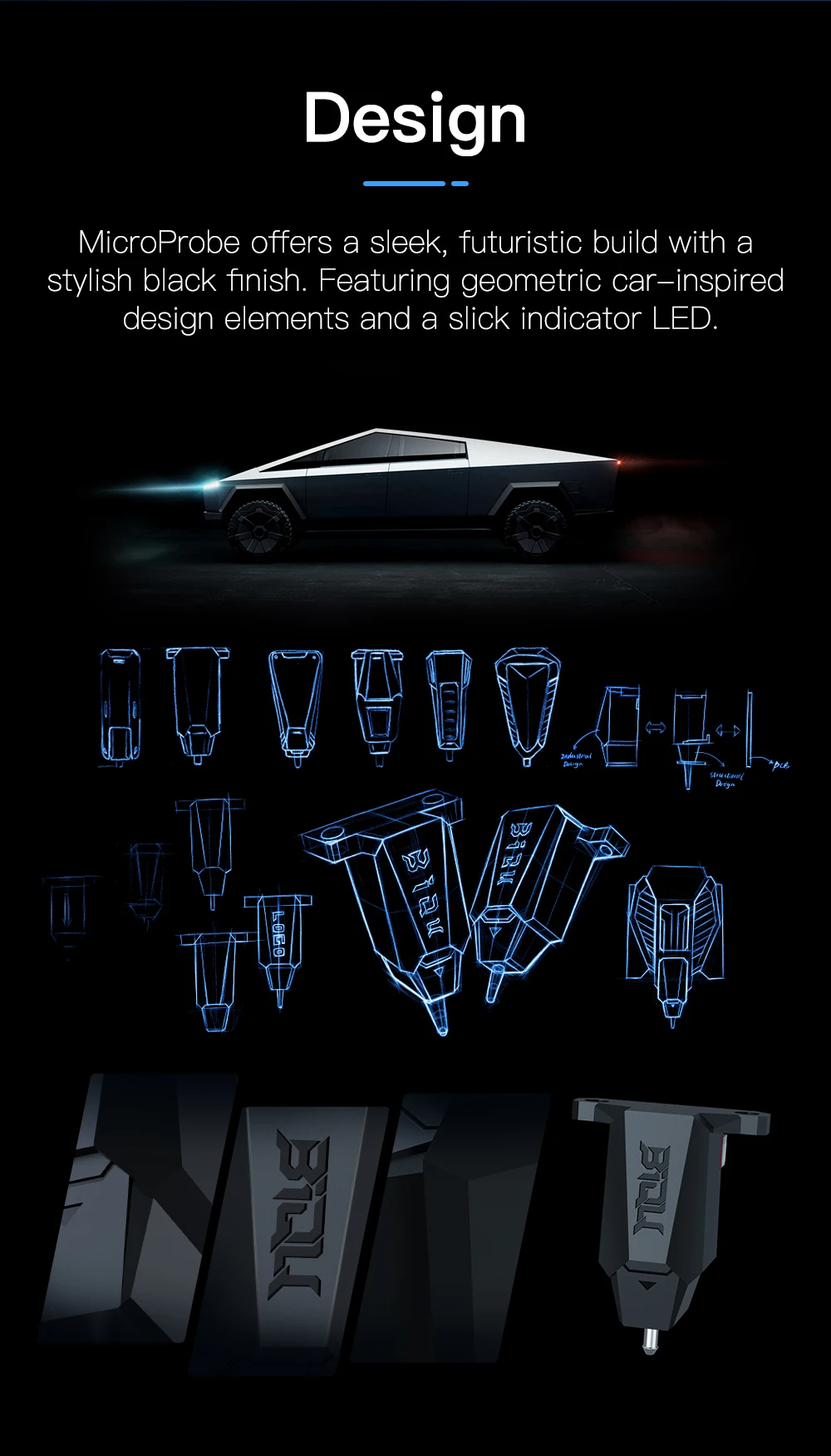 MicroProbe предлагает гладкий, футуристический корпус со стильным черным покрытием. Благодаря геометрической автомобиль-вдохновил